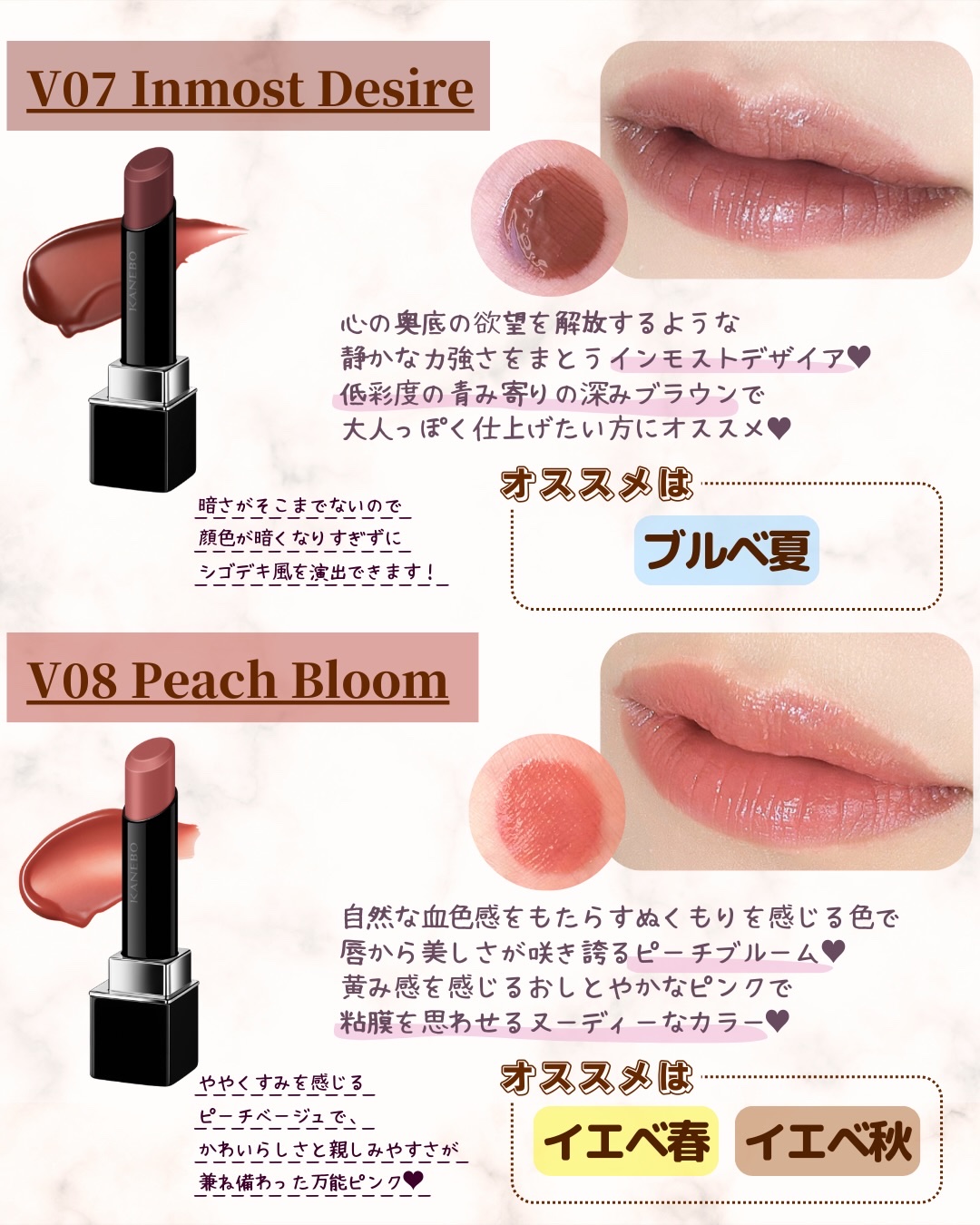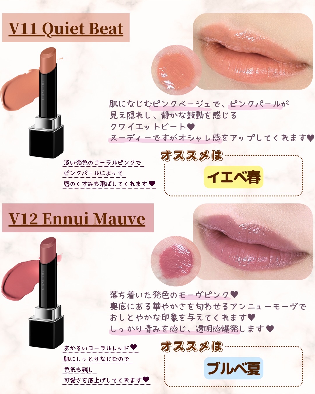 唇がパンっとむっちり綺麗に見える生ツヤ質感 ②保湿力があり、とろけるような塗り心地の良さ とにかく落ちないという訳ではないが決して汚くは落ちない 圧倒的にイエベカラー率🌼!! 2ndイエベのブルベカラーが無さすぎると思う