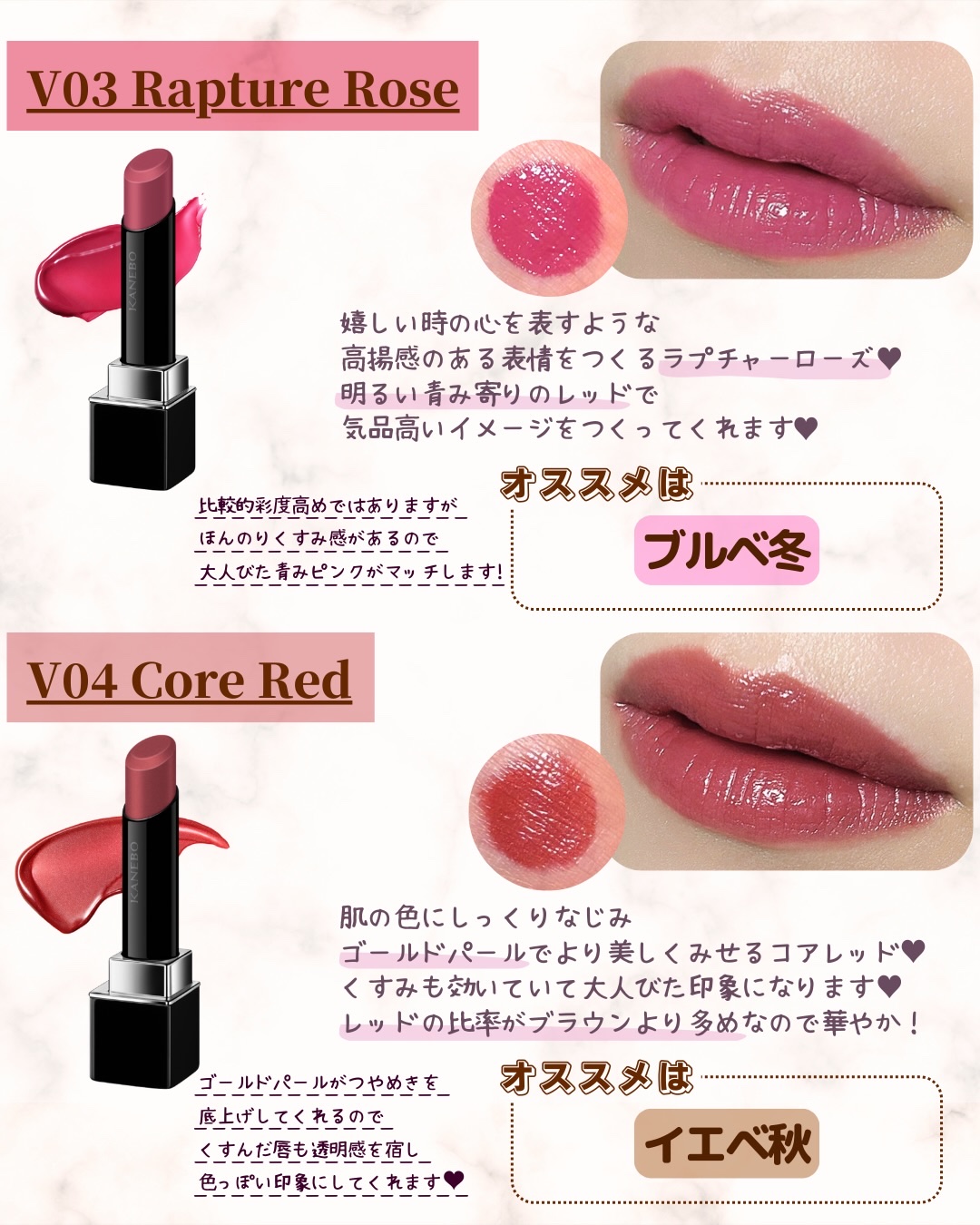 - <EX3 Cranberry Drop> 水添ポリイソブテン、ラウロイルグルタミン酸ジ(フィトステリル/オクチルドデシル)、トリ(カプリル酸/カプリン酸)グリセリル、ラウロイルグルタミン酸ジ(オクチルドデシル/フィトステリル/ベヘニル)、イソノナン酸イソトリデシル、ダイマージリノール酸(フィトステリル/イソステアリル/セチル/ステアリル/ベヘニル)、パラフィン、ポリエチレン、オクチルドデカノール、マイクロクリスタリンワックス、水添マイクロクリスタリンワックス、パルミトイルヒドロキシプロピルセルロース、ヒドロキシステアリン酸エチルヘキシル、トコフェロール、トリポリヒドロキシステアリン酸ジペンタエリスリチル、デカイソステアリン酸ポリグリセリル- 10、マカデミア種子油、マカデミアナッツ脂肪酸フィトステリル、アンズ核油、カニナバラ果実油、(エチレン/プロピレン)コポリマー、ジメチコン、ダイズ油、クエン酸、ニンジン根エキス、(+/-)(チタン/酸化チタン)焼結物、グンジョウ、セルロース、パルミチン酸、マイカ、ラウロイルアスパラギン酸Na、ラウロイルリシン、塩化亜鉛、酸化チタン、酸化鉄、水酸化Al、硫酸Ba、トリイソステアリン酸イソプロピルチタン、合成フルオロフロゴパイト、黄4、赤104(1)、赤201、赤202、赤223 <EX4 Guava Punch> 水添ポリイソブテン、ラウロイルグルタミン酸ジ(フィトステリル/オクチルドデシル)、トリ(カプリル酸/カプリン酸)グリセリル、ラウロイルグルタミン酸ジ(オクチルドデシル/フィトステリル/ベヘニル)、イソノナン酸イソトリデシル、ダイマージリノール酸(フィトステリル/イソステアリル/セチル/ステアリル/ベヘニル)、パラフィン、ポリエチレン、オクチルドデカノール、マイクロクリスタリンワックス、水添マイクロクリスタリンワックス、パルミトイルヒドロキシプロピルセルロース、ヒドロキシステアリン酸エチルヘキシル、トコフェロール、トリポリヒドロキシステアリン酸ジペンタエリスリチル、デカイソステアリン酸ポリグリセリル- 10、マカデミア種子油、マカデミアナッツ脂肪酸フィトステリル、アンズ核油、カニナバラ果実油、(エチレン/プロピレン)コポリマー、ジメチコン、ダイズ油、クエン酸、ニンジン根エキス、(+/-)(チタン/酸化チタン)焼結物、グンジョウ、セルロース、パルミチン酸、マイカ、ラウロイルアスパラギン酸Na、ラウロイルリシン、塩化亜鉛、酸化チタン、酸化鉄、水酸化Al、硫酸Ba、トリイソステアリン酸イソプロピルチタン、合成フルオロフロゴパイト、黄4、赤104(1)、赤201、赤202、赤223 <V01 Cupid Stone> 水添ポリイソブテン、ラウロイルグルタミン酸ジ(フィトステリル/オクチルドデシル)、トリ(カプリル酸/カプリン酸)グリセリル、ラウロイルグルタミン酸ジ(オクチルドデシル/フィトステリル/ベヘニル)、イソノナン酸イソトリデシル、ダイマージリノール酸(フィトステリル/イソステアリル/セチル/ステアリル/ベヘニル)、パラフィン、ポリエチレン、オクチルドデカノール、マイクロクリスタリンワックス、水添マイクロクリスタリンワックス、パルミトイルヒドロキシプロピルセルロース、ヒドロキシステアリン酸エチルヘキシル、トコフェロール、トリポリヒドロキシステアリン酸ジペンタエリスリチル、デカイソステアリン酸ポリグリセリル-10、マカデミア種子油、マカデミアナッツ脂肪酸フィトステリル、アンズ核油、カニナバラ果実油、(エチレン/プロピレン)コポリマー、ジメチコン、ダイズ油、クエン酸、ニンジン根エキス、(+/-)(チタン/酸化チタン)焼結物、グンジョウ、シリカ、セルロース、パルミチン酸、マイカ、ラウロイルアスパラギン酸Na、ラウロイルリシン、塩化亜鉛、酸化チタン、酸化鉄、水酸化Al、硫酸Ba、トリイソステアリン酸イソプロピルチタン、酸化スズ、ホウケイ酸(Ca/Al)、合成フルオロフロゴパイト、黄4、黄5、赤104(1)、赤201、赤202、赤223、橙201 <V02 Classical Red> 水添ポリイソブテン、ラウロイルグルタミン酸ジ(フィトステリル/オクチルドデシル)、トリ(カプリル酸/カプリン酸)グリセリル、ラウロイルグルタミン酸ジ(オクチルドデシル/フィトステリル/ベヘニル)、イソノナン酸イソトリデシル、ダイマージリノール酸(フィトステリル/イソステアリル/セチル/ステアリル/ベヘニル)、パラフィン、ポリエチレン、オクチルドデカノール、マイクロクリスタリンワックス、水添マイクロクリスタリンワックス、パルミトイルヒドロキシプロピルセルロース、ヒドロキシステアリン酸エチルヘキシル、トコフェロール、トリポリヒドロキシステアリン酸ジペンタエリスリチル、デカイソステアリン酸ポリグリセリル-10、マカデミア種子油、マカデミアナッツ脂肪酸フィトステリル、アンズ核油、カニナバラ果実油、(エチレン/プロピレン)コポリマー、ジメチコン、ダイズ油、クエン酸、ニンジン根エキス、(+/-)(チタン/酸化チタン)焼結物、グンジョウ、シリカ、セルロース、パルミチン酸、マイカ、ラウロイル