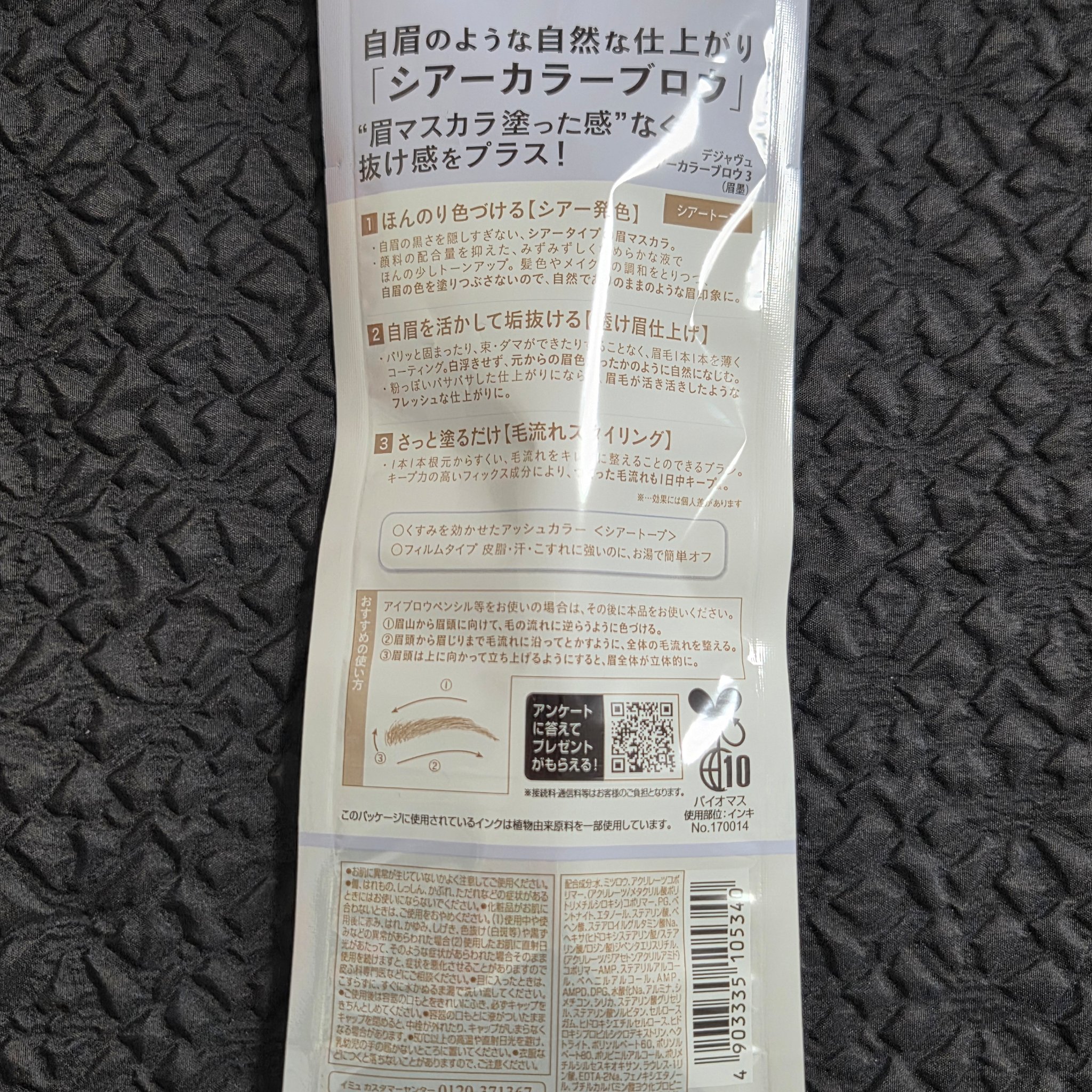 - \\デジャヴュからの新提案!自眉を活かしたシアーな色づきの眉マスカラ// 「シアーカラーブロウ」は、水彩絵の具のように“シアーな色づき”と、“美しい毛流れ”、 さらにパサつきのない“しっとりした質感”を1本で叶える眉マスカラ。 まるで元の眉がそのまま色づくような、“究極のナチュラル眉”に仕上げます*。 フィルムタイプで、皮脂・汗・こすれに強いのに、お湯だけで簡単に落とせます。 ※2025年12月以降、全国のバラエティストア、イミュ公式オンラインストアにて発売中! *ブランド内において デジャヴュ シアーカラーブロウ