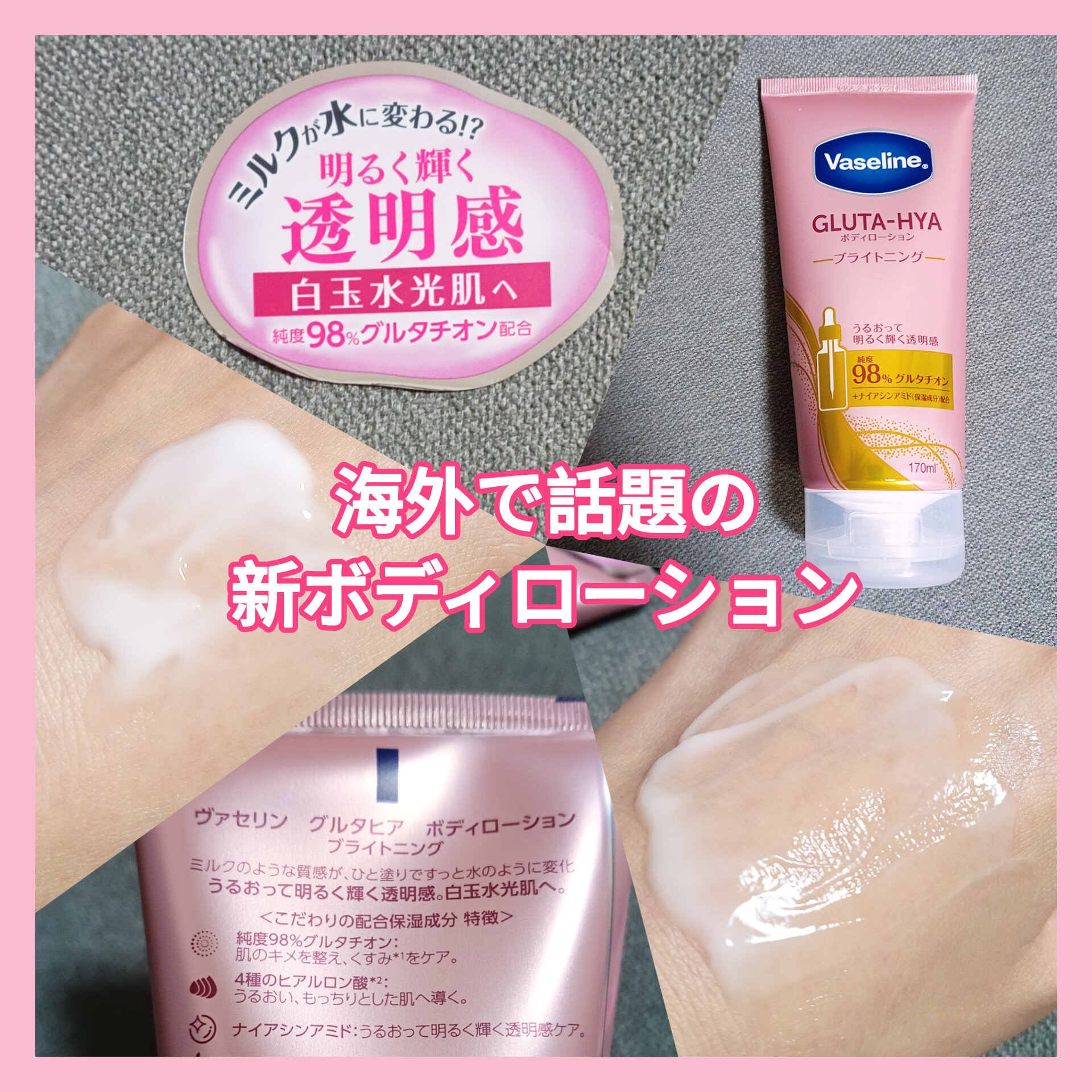 ヴァセリンGLUTA-HYA(グルタヒア)ボディローション ブライトニング海外の方ではすでに発売されてたみたいですね。日本では2月に発売予定。グルタチオン、ヒアルロン酸、ナイアシンアミドなど、こだわりの保湿成分配合。うるおって明るく輝...