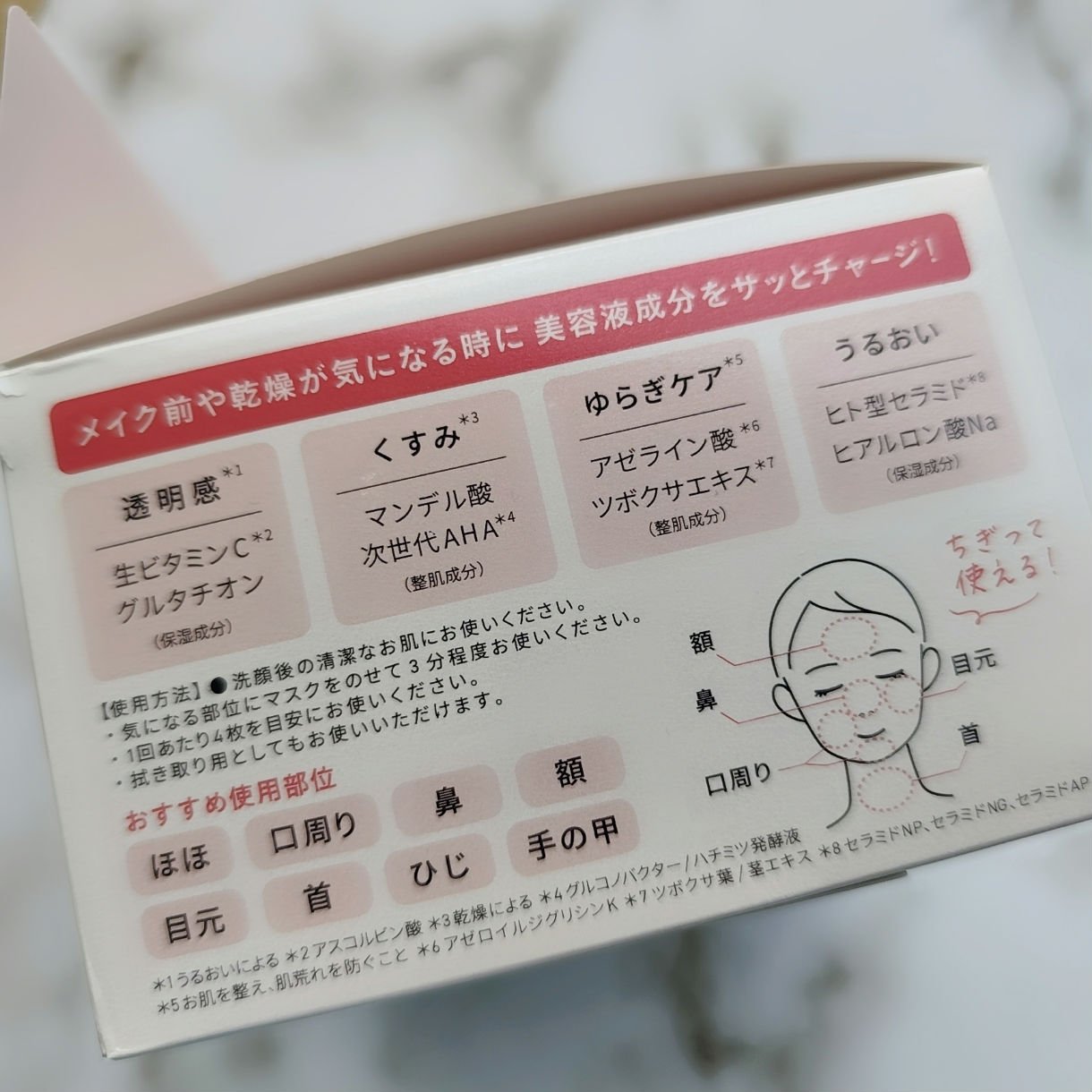 - ① 生ビタミンC×グルタチオンで、輝きあふれる透明感へ。与える+オフのWアプローチ Yunthでおなじみの生ビタミンC※1に加え、グルタチオン※2やセラミド※3、ヒアルロン酸※4など肌の保湿と透明感※5を底上げする成分だけでなく、ふき取り用途として次世代型AHA※6、肌を整えるアゼライン酸※7やツボクサエキス※8も配合。あらゆる肌悩みに多角的にアプローチする処方設計です。 ※1 アスコルビン酸 ※2 グルタチオン (保湿) ※3 セラミドNP、セラミドNG、セラミドAP (保湿) ※4 ヒアルロン酸Na (保湿) ※5 うるおいによる ※6 グルコノバクター/ハチミツ発酵液 (整肌) ※7 アゼロイルジグリシンK (整肌) ※8 ツボクサ葉/茎エキス (整肌) ②たっぷり使える120枚入り。毎日使いやすい“ちぎれる”スクエア形状 液含みがよく、手で簡単にちぎれるシートを採用。 顔全体はもちろん、小鼻・目元・首元など気になるパーツにサッと貼ることができます。お好みのサイズにちぎって、Tゾーンや目元などのピンポイントケアにも最適です。たっぷり使える大容量120枚入り。 ③高密着&高保のシートで忙しい朝でも3分で潤いチャージ 絶妙な厚みの高密着シートが肌にぴたりとフィットし、美容液のうるおいをしっかり届けます。たった3分で肌をみずみずしく整え、メイクのノリもアップ。夏のメイク崩れも防ぎやすくします。「毎日のスキンケアをもっと手軽に」「隙間時間に賢くケアしたい」という方にぴったりの時短アイテムです。 ④肌にやさしい6つのフリー パラベン、エタノール、鉱物油、石油系界面活性剤、香料、着色料がフリー。毎日使えるやさしい使い心地を追求しました。