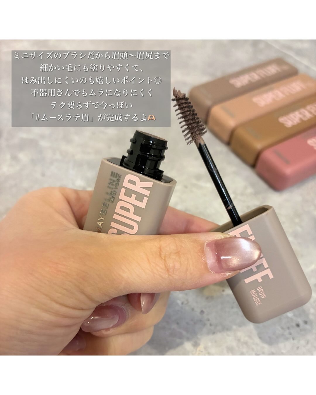- \NO MORE パリパリ眉!/ 1日*ずっと、ほわっふわ眉。ムラなく色づき、黒眉ミュート ★商品特徴 ①エアリームーステクスチャー 空気とパウダーを混ぜて泡立てたような、軽やかなホイップムーステクスチャーだから、 べったりつかず、固くならない。ふわふわ仕上がり24時間*つづく。 ②テク要らずミニブラシ 先端に向かって細くなるブラシが、細かい毛も余さずキャッチするから、眉頭から眉尻まで均一にムラなく塗れる。 ③全5色展開 なりたい印象に合わせて選べる5色展開。 自眉の黒を消して存在感を抑えたい方にも、髪色に合わせた自然な眉にしたい方にも。 ★カラー展開 -ピンクアッシュ :いちごムースラテ -ライトブラウン :キャラメルムースラテ -ヌードベージュ :バニラムースラテ -アッシュブラウン:ミルクチョコムースラテ -グレーブラウン :ごまムースラテ * メイベリンニューヨーク調べ。個人差があります。
