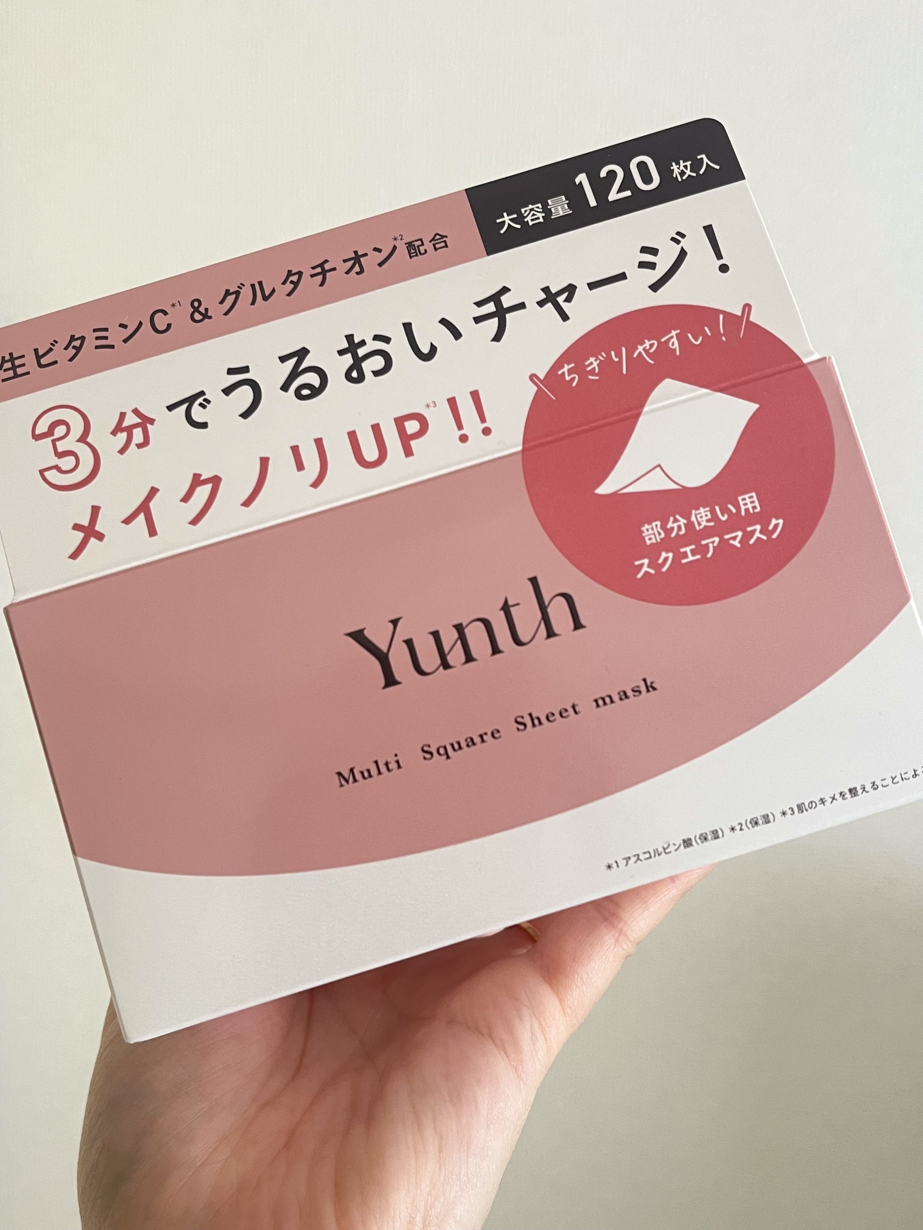 - ① 生ビタミンC×グルタチオンで、輝きあふれる透明感へ。与える+オフのWアプローチ Yunthでおなじみの生ビタミンC※1に加え、グルタチオン※2やセラミド※3、ヒアルロン酸※4など肌の保湿と透明感※5を底上げする成分だけでなく、ふき取り用途として次世代型AHA※6、肌を整えるアゼライン酸※7やツボクサエキス※8も配合。あらゆる肌悩みに多角的にアプローチする処方設計です。 ※1 アスコルビン酸 ※2 グルタチオン (保湿) ※3 セラミドNP、セラミドNG、セラミドAP (保湿) ※4 ヒアルロン酸Na (保湿) ※5 うるおいによる ※6 グルコノバクター/ハチミツ発酵液 (整肌) ※7 アゼロイルジグリシンK (整肌) ※8 ツボクサ葉/茎エキス (整肌) ②たっぷり使える120枚入り。毎日使いやすい“ちぎれる”スクエア形状 液含みがよく、手で簡単にちぎれるシートを採用。 顔全体はもちろん、小鼻・目元・首元など気になるパーツにサッと貼ることができます。お好みのサイズにちぎって、Tゾーンや目元などのピンポイントケアにも最適です。たっぷり使える大容量120枚入り。 ③高密着&高保のシートで忙しい朝でも3分で潤いチャージ 絶妙な厚みの高密着シートが肌にぴたりとフィットし、美容液のうるおいをしっかり届けます。たった3分で肌をみずみずしく整え、メイクのノリもアップ。夏のメイク崩れも防ぎやすくします。「毎日のスキンケアをもっと手軽に」「隙間時間に賢くケアしたい」という方にぴったりの時短アイテムです。 ④肌にやさしい6つのフリー パラベン、エタノール、鉱物油、石油系界面活性剤、香料、着色料がフリー。毎日使えるやさしい使い心地を追求しました。