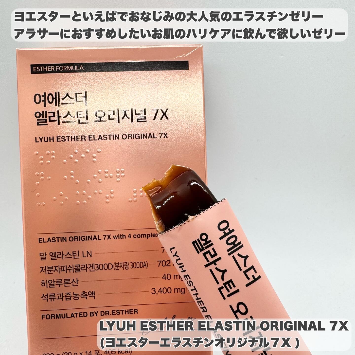 LYUHESTHERELASTINORIGINAL7X(ヨエスターエラスチンオリジナル7X)このゼリーは本当に味がおいしくておすすめ!濃厚なエラスチンでお肌のハリをケア✨️これ1本で、エラスチンと共に吸収しやすい・超低分子コラーゲン・ヒアルロ...