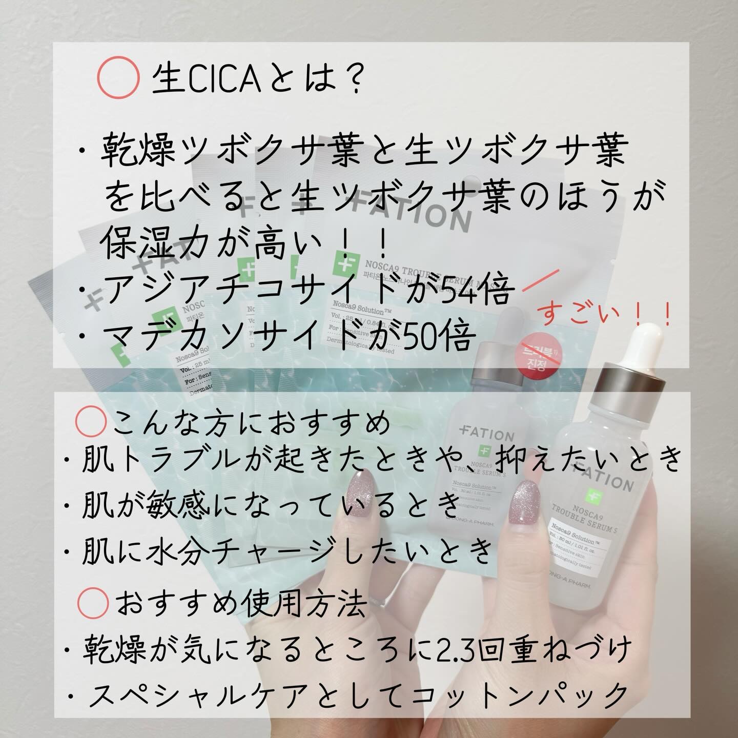 FATION✨ノスカナイントラブルセラムマスクパックSより優れた生CICA成分含有美容液をたっぷり含んだ柔らかいマイクロファイバーシート柔らかでしっかりめなシート。エッセンスヒタヒタ。気持ちいい!密着が高くてずれてこないのが嬉しいです。馴染み...