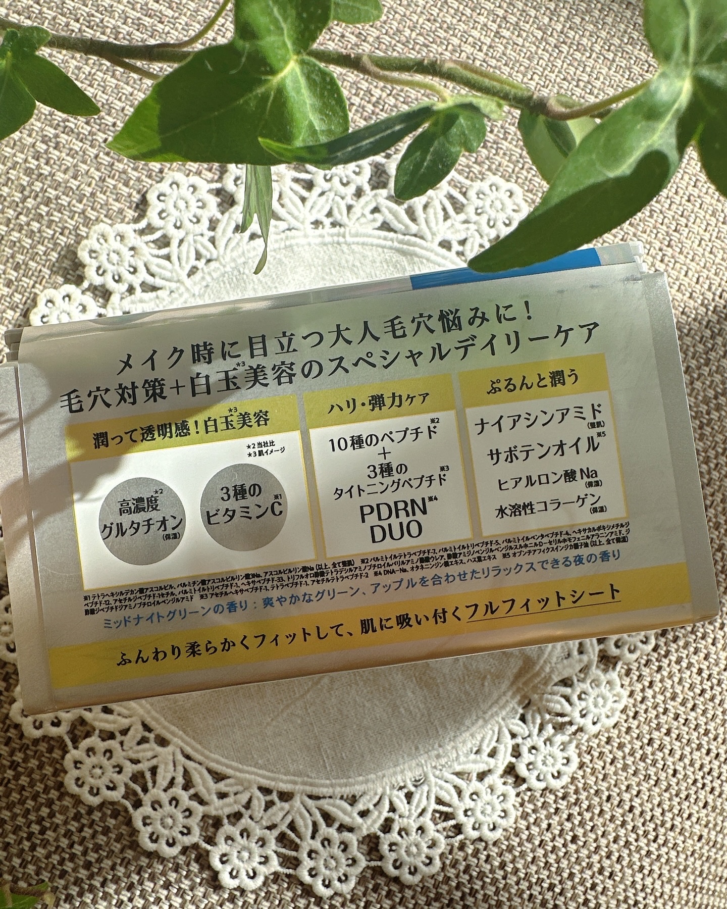 - メイク時に目立つ毛穴悩みに、毛穴対策+白玉*¹美容のスペシャルなデイリーケア。おやすみ前のお手入れはこれ1枚で完了!オールインワン処方の夜用マスク。 リッチな潤い成分配合で肌に美しい透明感。 【高濃度*²グルタチオン(保湿)】アミノ酸からなる成分で、美しく透明感のある肌に 【3種のビタミンC*³】 毛穴ゆるみをキュッとタイトニングしてもっちり肌。 毛穴の目立ちにくいハリと弾力のあるもっちり肌へと導きます。 【10種のペプチド】 ・パルミトイルテトラペプチド-7 ・パルミトイルトリペプチド-5 ・パルミトイルペンタペプチド-4 ・ヘキサカルボキシメチルジペプチド-12 ・アセチルジペプチド-1セチル ・パルミトイルトリペプチド-1 ・ヘキサペプチド-33 ・トリフルオロ酢酸テトラデシルアミノブチロイルバリルアミノ酪酸ウレア ・酢酸アミジノベンジルベンジルスルホニルD-セリルホモフェニルアラニンアミド ・ジ酢酸ジペプチドジアミノブチロイルベンジルアミド 【3種のタイトニングペプチド】 ・アセチルヘキサペプチド-1 ・テトラペプチド-1 ・アセチルテトラペプチド-2 【PDRN DUO】 ・DNA-Na ・オタネニンジン根エキス ・ハス葉エキス(以上、全て保湿) ナイアシンアミド配合で、肌のベースからアプローチ。 たっぷりの保湿成分とナイアシンアミド(整肌成分)を配合。 肌を内側からぷるんと白玉*¹肌へと整えます。 ・ナイアシンアミド(整肌) ・サボテンオイル*⁴ ・ヒアルロン酸Na(保湿) ・水溶性コラーゲン(保湿) 1枚貼るだけ!オールインワン処方 化粧水+乳液+美容液+クリーム+パック <小鼻を包み込むサボリーノオリジナルシートマスク> 液含みの良いシートで、肌あたりも優しくたっぷりひたひたの使い心地です。 サイドの切れ込みを持ち上げるように引き上げてお使いください。 ミッドナイトグリーンの香り 爽やかなグリーンの香りにアップルの香りを合わせた、 夜のひとときをリラックスさせてくれる香りです。 *1 肌イメージ *2 当社比 *3 テトラヘキシルデカン酸アスコルビル、パルミチン酸アスコルビルリン酸3Na、アスコルビルリン酸Na(以上、全て整肌) *4 オプンチアフィクスインジカ種子油(保湿)