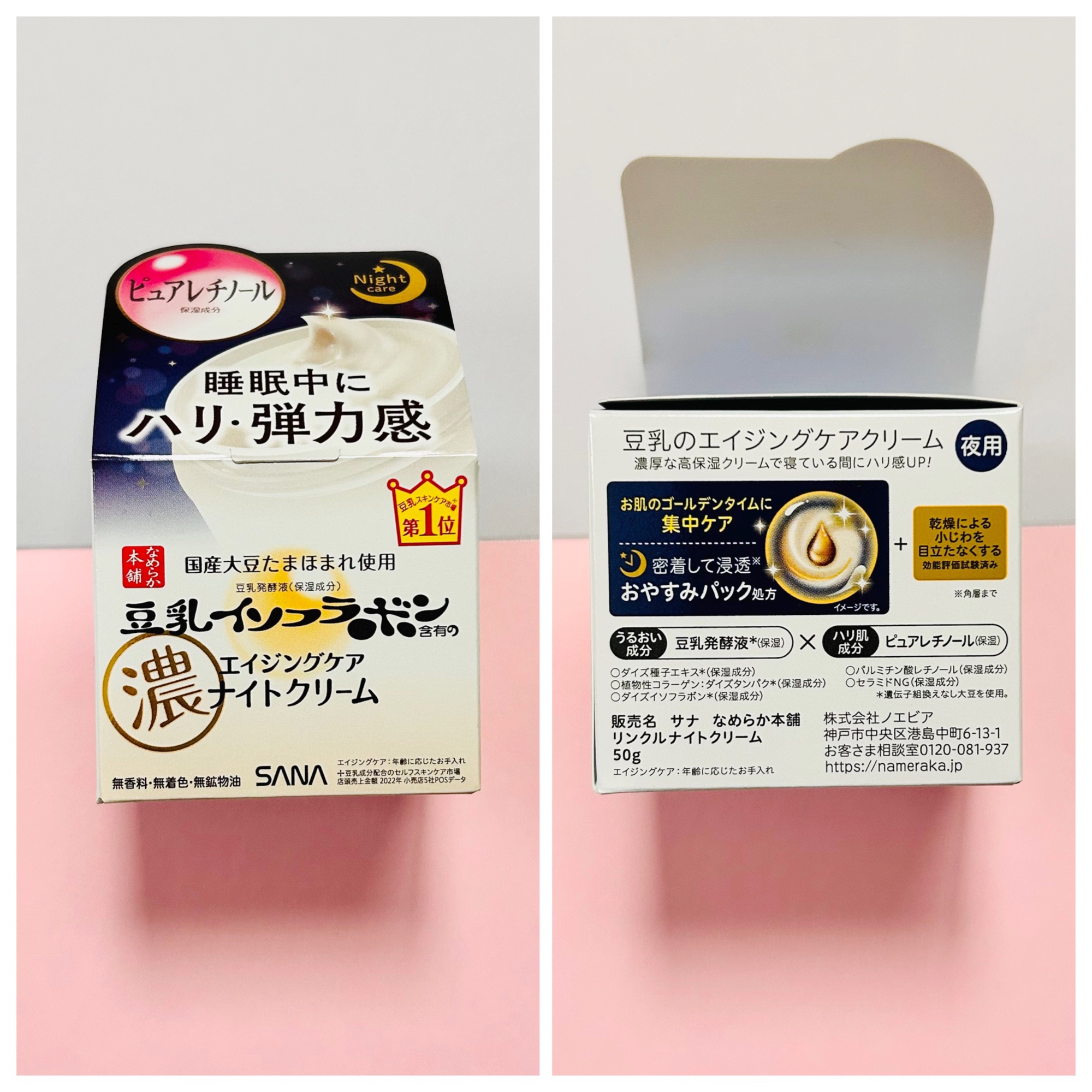 - リンクルラインからナイトクリームが新登場! ピュアレチノール*1を新配合の濃厚クリームが一晩かけて密着して浸透*2する、おやすみパック処方です。 商品特徴 〔 ①ピュアレチノール*1×豆乳発酵液*1配合で本格スキンケア 〕 『なめらか本舗』オリジナルのイソフラボン含有の豆乳発酵液*1に加え、ピュアレチノール*1を新配合! お肌にハリ・弾力感を与えます。 〔 ②夜のしっかりケアで乾燥による小じわを目立たなくします*3! 〕 肌ストレスの少ない夜のお手入れをおすすめします。 新登場のナイトクリームはおやすみパック処方を採用し、濃厚なクリームが一晩中肌に密着しつつ、乾燥による小じわ目立たなくします。 〔 ③3ステップの重ね技ケア! 〕 化粧水、乳液も新テクスチャーで保湿感がパワーアップ! リンクルライン3品一緒に使用するのがおすすめです。 *1 保湿成分 *2 角層まで *3 効能評価試験済み