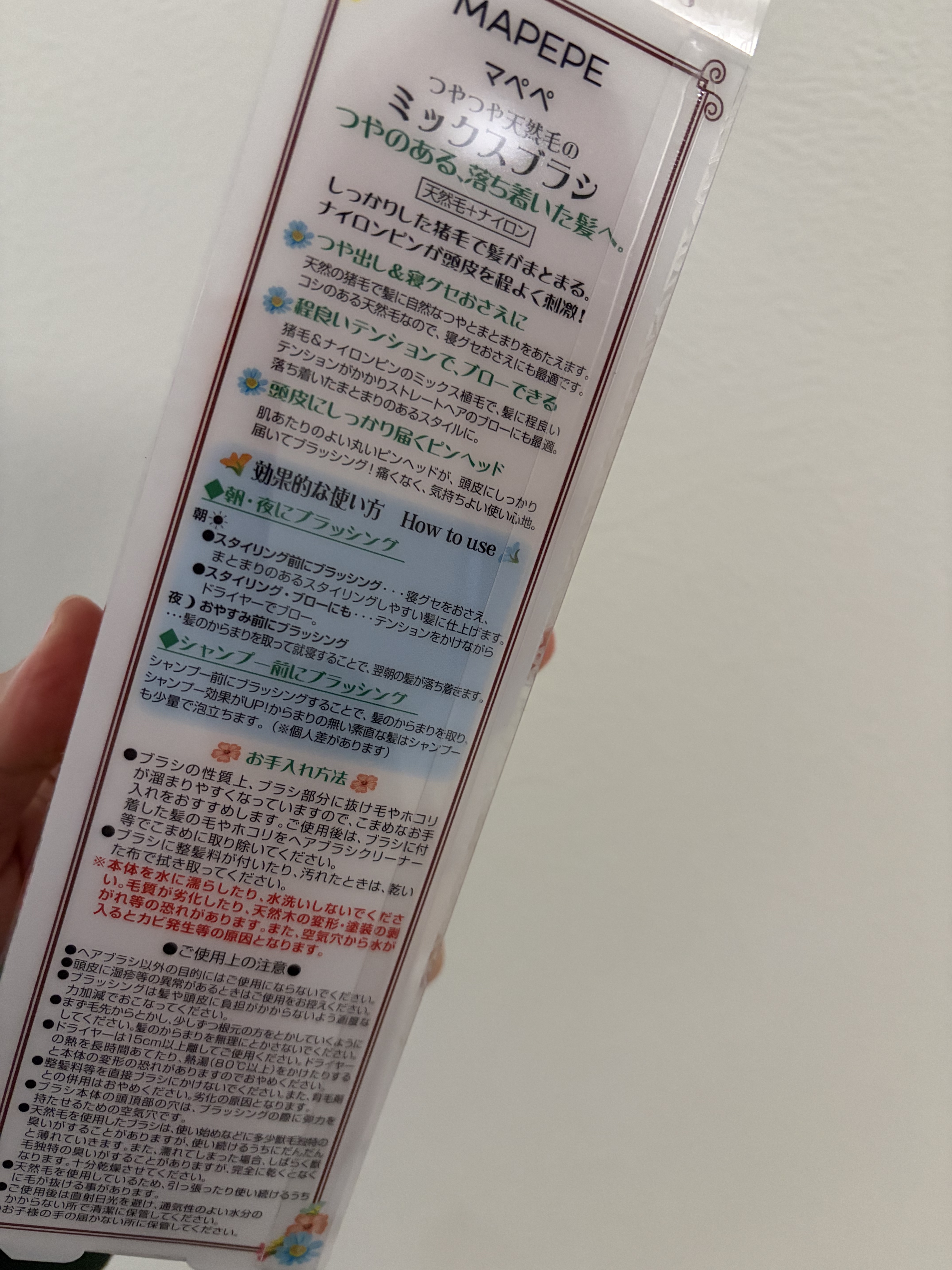 ブラシ買い替えてますか?マペペつやつや天然毛のミニミックスブラシ通常サイズを持っていてミニサイズを買ってみました!ピンや毛の長さは変わらないように見えるけど、やっぱりかなりコンパクトで毛量多めな私には使いづらかったです。ショートヘアの母にはち...