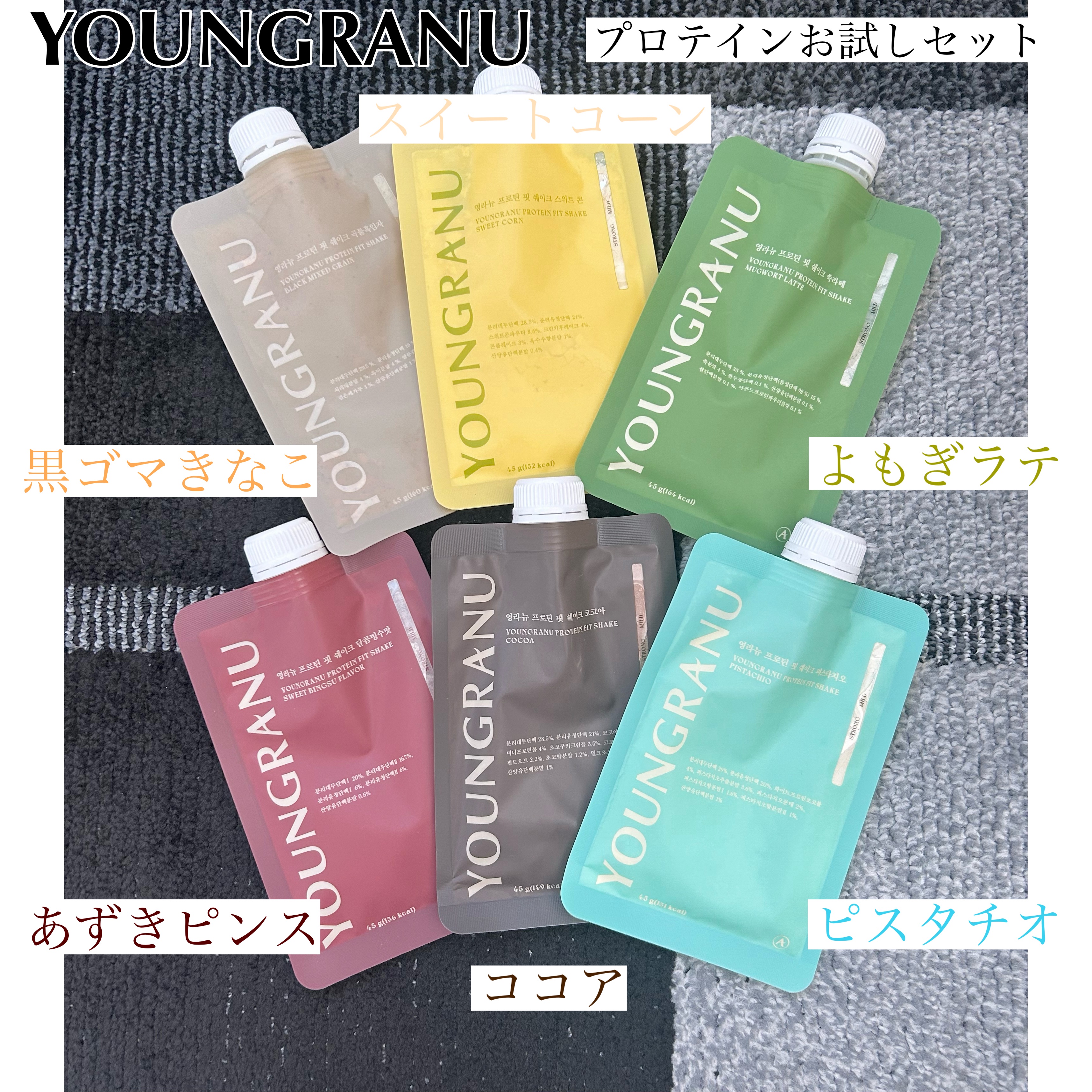 ・ YOUNGRANUプロテインフィットシェイクあずきピンススイートコーンヨモギラテピスタチオ穀物黒ゴマココアの全6種類1包約20gのタンパク質とたくさんの栄養素を補ってくれる珍しいフレーバーが揃ってるのも置き換えダイエットにもぴったりな満足...