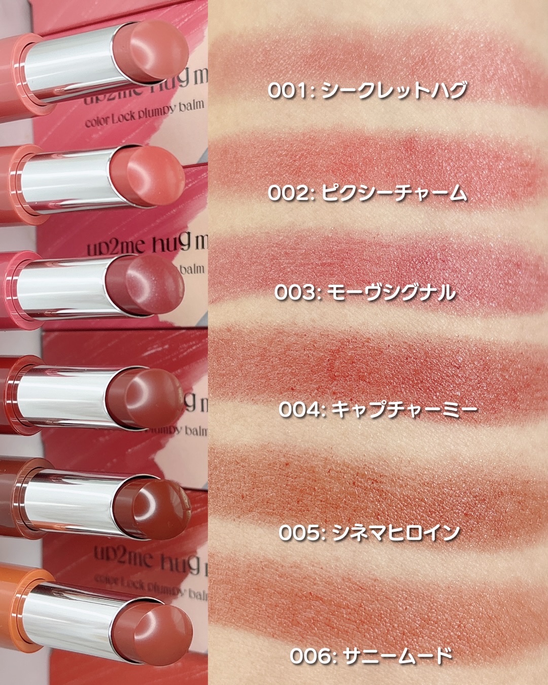 アップトゥーミーハグマイリップカラーロックプランピーバームを使ってみたよ💗このリップただ可愛いだけじゃなくて、むっちり質感×発色がずっと続くの🫥秘密は「ジェル膜処方」と「プランプ効果」✨つけた瞬間のちゅるん感が消えにくいのが好き🥹全色スウォッ...