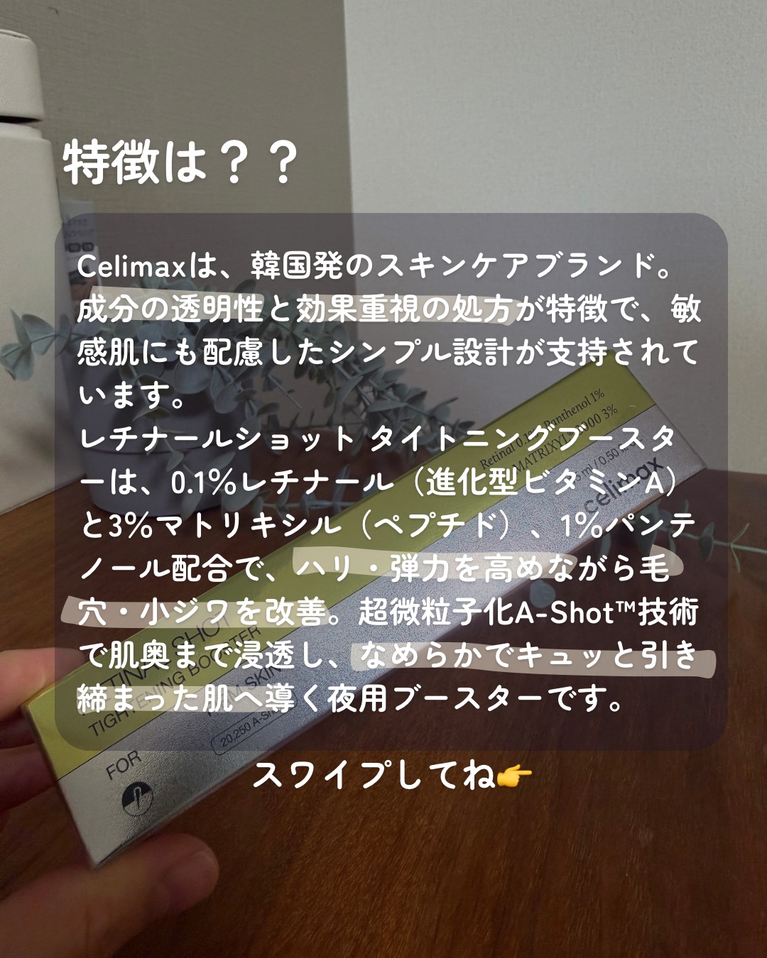 本日はPR投稿です!こんにちは!むいです!🐰本日も閲覧いただきありがとうございます☀️今回は、celimaxの「レチナールショットタイトニングブースター」を頂いたので使ってみました🍋レチナールは、レチノールよりも肌の中で効率よく働くといわれて...