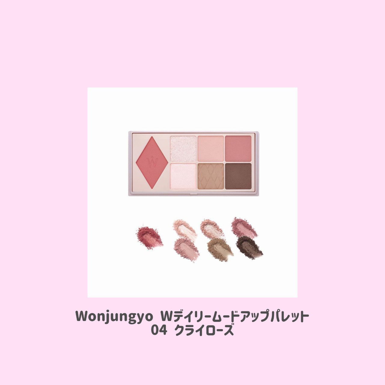 Wonjungyoのデイリームードアップパレットが有能すぎるので、04 クライローズも追加でゲット!!!👑♡ 発色も粉質もふわっとしてるから、失敗しにくくて初心者さんでも挑戦しやすい! チークとアイシャドウが一緒になってるのも素晴らしいし、2種類のラメがほんっとに可愛い🥺