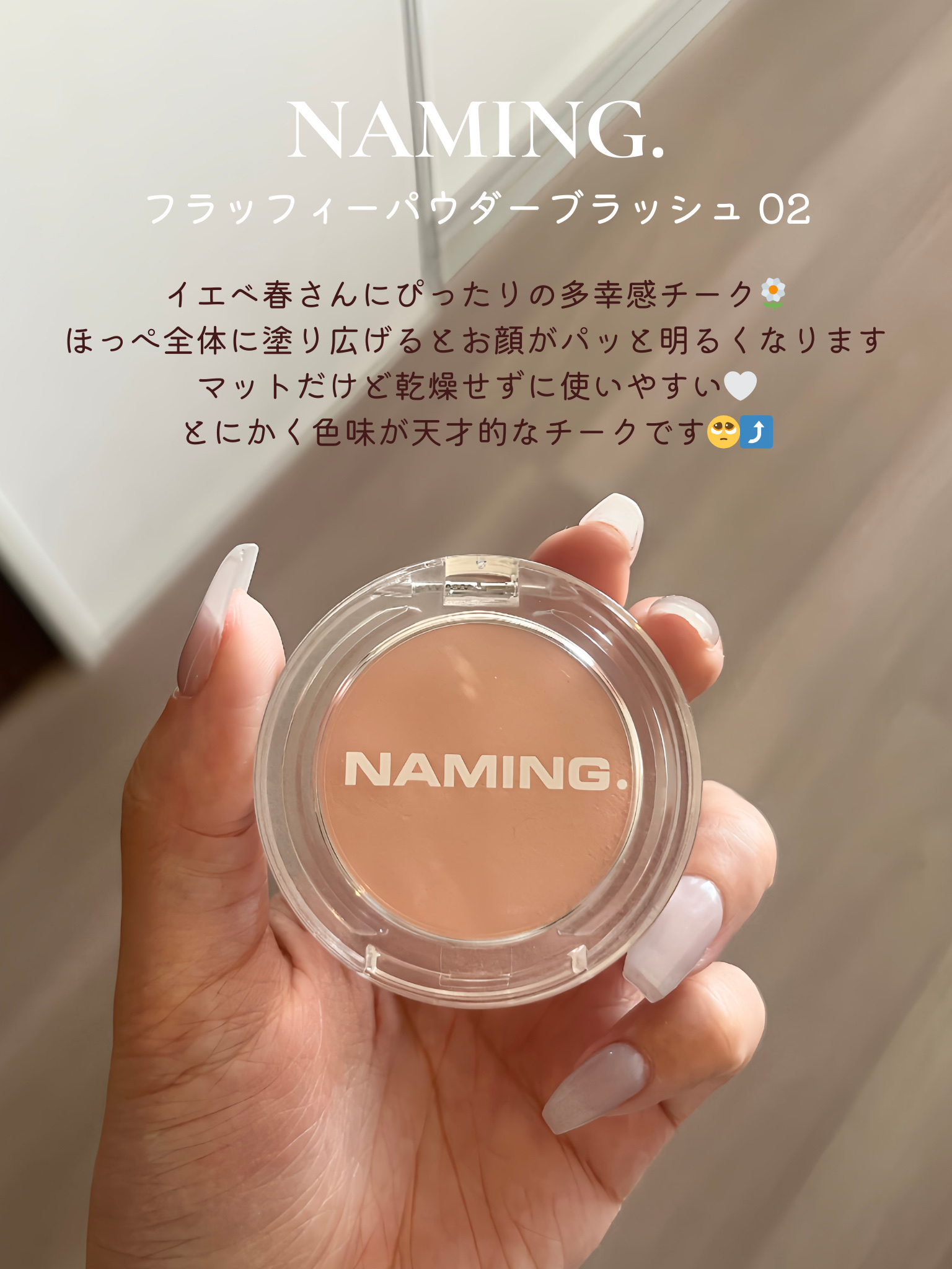 \可愛すぎた!万能チーク紹介/NAMING.フラッフィーパウダーブラッシュこれは万能すぎた🤦♀️可愛すぎて他のカラーもほしい~ふわっと発色してくれて使いやすい!!カラー展開が豊富で何買おうか悩むぐらいだからこそどんなタイプの人でも合うカラー...