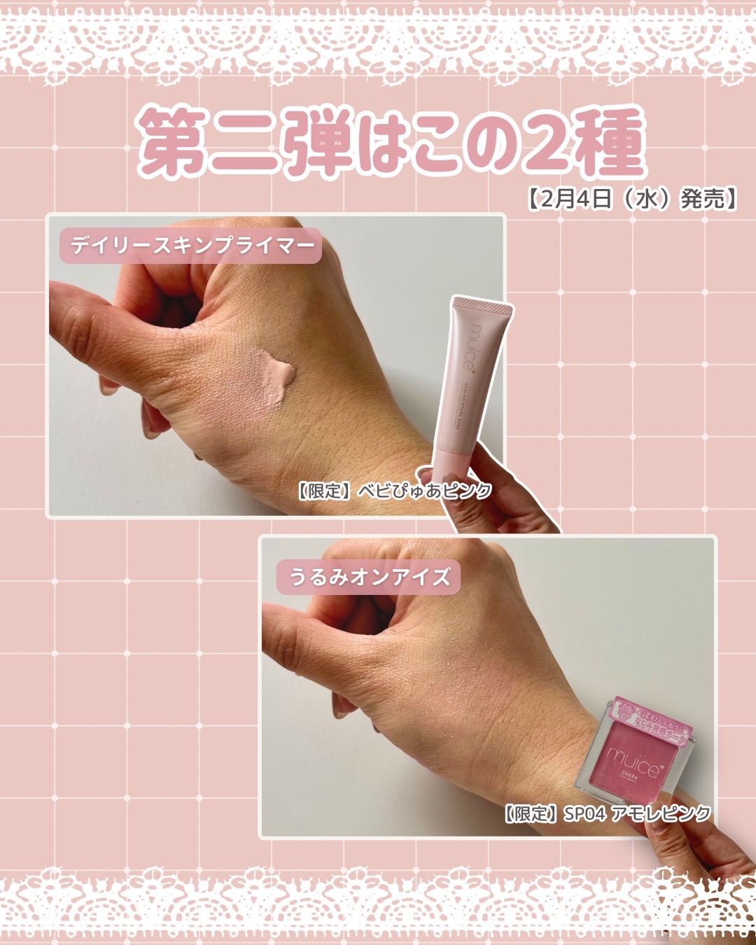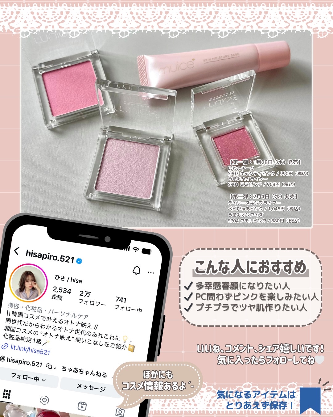 \muice春ピンクコレクション🌸/💎muice☑️うるみハイライター⚫︎SP01ミミピンク【限定】¥968(税込)☑️ぽわんチーク⚫︎SP03キャンディピンク【限定】¥990(税込)👆1月28日(水)発売☑️ミュアイスうるみオンアイズ⚫︎S...