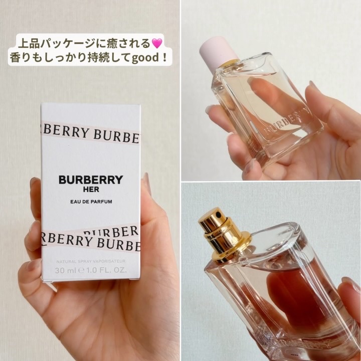 BurberryBeautyバーバリーハーオードパルファム憧れのバーバーリーのオードパルファム💫首元や手首につけて使用🙌肌にやさしく押さえるように馴染ませています。香りは甘さのある上品な香り。華やかさも感じられてとても好きな香りでした💐香りの...