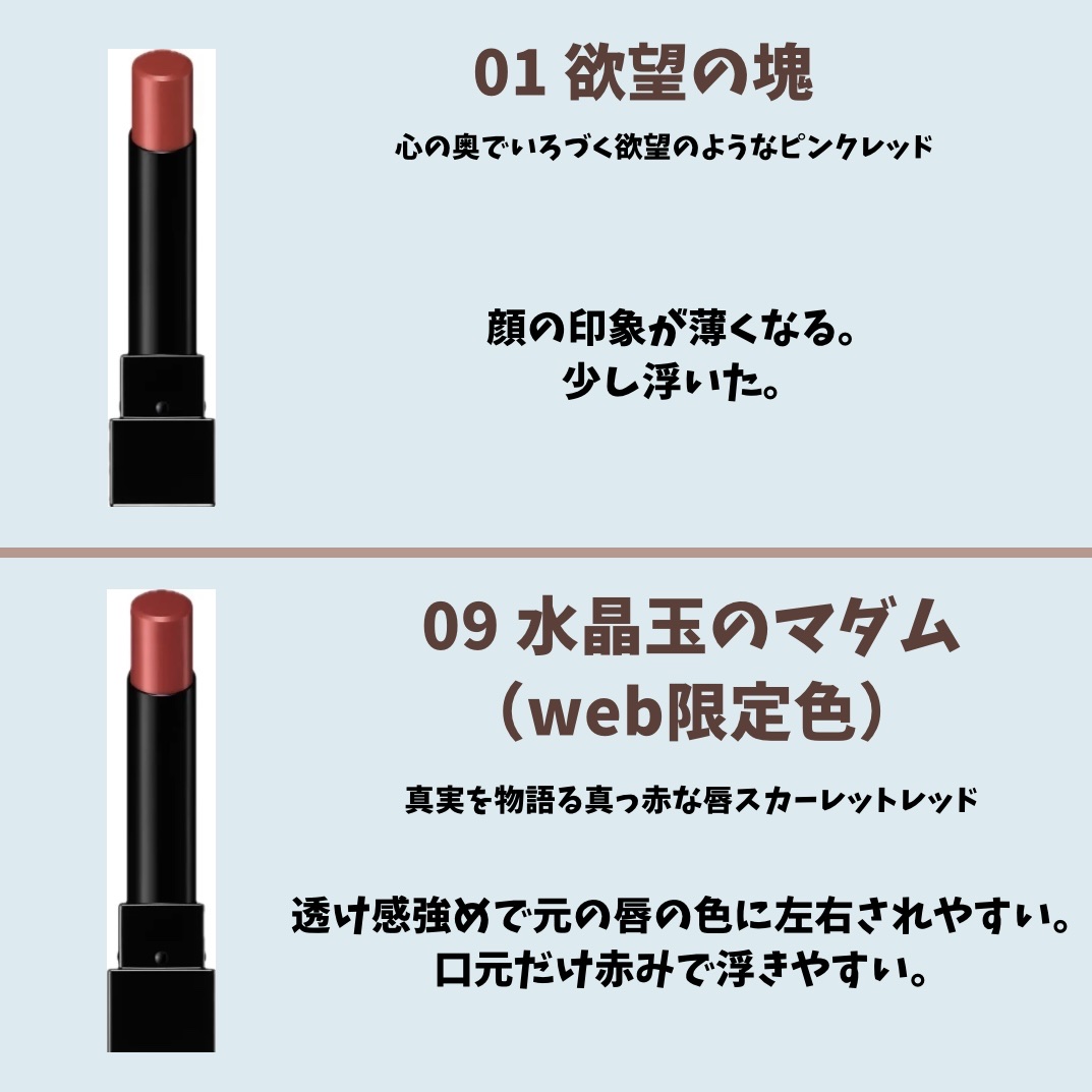- <01 欲望の塊> テトライソステアリン酸ジペンタエリスリチル、トリ(カプリル酸/カプリン酸)グリセリル、オクチルドデカノール、ラウロイルグルタミン酸ジ(フィトステリル/オクチルドデシル)、ビスアルキル(C16-18)グリセリルウンデシルジメチコン、イソノナン酸イソトリデシル、水添ポリイソブテン、ラウロイルグルタミン酸ジ(オクチルドデシル/フィトステリル/ベヘニル)、パラフィン、合成ワックス、ダイマージリノール酸(フィトステリル/イソステアリル/セチル/ステアリル/ベヘニル)、マイクロクリスタリンワックス、水添マイクロクリスタリンワックス、ヒドロキシステアリン酸エチルヘキシル、トコフェロール、ホホバ種子油、オリーブ果実油、アーモンド油、(エチレン/プロピレン)コポリマー、ポリエチレン、ジメチコン、(+/-)(チタン/酸化チタン)焼結物、マイカ、ラウロイルアスパラギン酸Na、ラウロイルリシン、塩化亜鉛、酸化チタン、酸化鉄、水酸化Al、硫酸Ba、トリイソステアリン酸イソプロピルチタン、酸化スズ、ホウケイ酸(Ca/Al)、合成フルオロフロゴパイト、黄4、黄5、赤104(1)、赤201、赤202 <02 ピンクバナナ> テトライソステアリン酸ジペンタエリスリチル、トリ(カプリル酸/カプリン酸)グリセリル、オクチルドデカノール、ラウロイルグルタミン酸ジ(フィトステリル/オクチルドデシル)、ビスアルキル(C16-18)グリセリルウンデシルジメチコン、イソノナン酸イソトリデシル、水添ポリイソブテン、ラウロイルグルタミン酸ジ(オクチルドデシル/フィトステリル/ベヘニル)、パラフィン、合成ワックス、ダイマージリノール酸(フィトステリル/イソステアリル/セチル/ステアリル/ベヘニル)、マイクロクリスタリンワックス、水添マイクロクリスタリンワックス、ヒドロキシステアリン酸エチルヘキシル、トコフェロール、ホホバ種子油、オリーブ果実油、アーモンド油、(エチレン/プロピレン)コポリマー、ポリエチレン、ジメチコン、(+/-)(チタン/酸化チタン)焼結物、マイカ、ラウロイルアスパラギン酸Na、ラウロイルリシン、塩化亜鉛、酸化チタン、酸化鉄、水酸化Al、硫酸Ba、トリイソステアリン酸イソプロピルチタン、酸化スズ、ホウケイ酸(Ca/Al)、合成フルオロフロゴパイト、黄4、黄5、赤104(1)、赤201、赤202 <03 陽炎> テトライソステアリン酸ジペンタエリスリチル、トリ(カプリル酸/カプリン酸)グリセリル、オクチルドデカノール、ラウロイルグルタミン酸ジ(フィトステリル/オクチルドデシル)、ビスアルキル(C16-18)グリセリルウンデシルジメチコン、イソノナン酸イソトリデシル、水添ポリイソブテン、ラウロイルグルタミン酸ジ(オクチルドデシル/フィトステリル/ベヘニル)、パラフィン、合成ワックス、ダイマージリノール酸(フィトステリル/イソステアリル/セチル/ステアリル/ベヘニル)、マイクロクリスタリンワックス、水添マイクロクリスタリンワックス、ヒドロキシステアリン酸エチルヘキシル、トコフェロール、ホホバ種子油、オリーブ果実油、アーモンド油、(エチレン/プロピレン)コポリマー、ポリエチレン、ジメチコン、(+/-)(チタン/酸化チタン)焼結物、マイカ、ラウロイルアスパラギン酸Na、ラウロイルリシン、塩化亜鉛、酸化チタン、酸化鉄、水酸化Al、硫酸Ba、トリイソステアリン酸イソプロピルチタン、酸化スズ、ホウケイ酸(Ca/Al)、合成フルオロフロゴパイト、黄4、黄5、赤104(1)、赤201、赤202 <04 パンプキンワイン(Web限定)> テトライソステアリン酸ジペンタエリスリチル、トリ(カプリル酸/カプリン酸)グリセリル、オクチルドデカノール、ラウロイルグルタミン酸ジ(フィトステリル/オクチルドデシル)、ビスアルキル(C16-18)グリセリルウンデシルジメチコン、イソノナン酸イソトリデシル、水添ポリイソブテン、ラウロイルグルタミン酸ジ(オクチルドデシル/フィトステリル/ベヘニル)、パラフィン、合成ワックス、ダイマージリノール酸(フィトステリル/イソステアリル/セチル/ステアリル/ベヘニル)、マイクロクリスタリンワックス、水添マイクロクリスタリンワックス、ヒドロキシステアリン酸エチルヘキシル、トコフェロール、ホホバ種子油、オリーブ果実油、アーモンド油、(エチレン/プロピレン)コポリマー、ポリエチレン、ジメチコン、(+/-)(チタン/酸化チタン)焼結物、マイカ、ラウロイルアスパラギン酸Na、ラウロイルリシン、塩化亜鉛、酸化チタン、酸化鉄、水酸化Al、硫酸Ba、トリイソステアリン酸イソプロピルチタン、酸化スズ、ホウケイ酸(Ca/Al)、合成フルオロフロゴパイト、黄4、黄5、赤104(1)、赤201、赤202 <05 ダークフィグ> テトライソステアリン酸ジペンタエリスリチル、トリ(カプリル酸/カプリン酸)グリセリル、オクチルドデカノール、ラウロイルグルタミン酸ジ(フィトステリル/オクチルドデシル)、ビスアルキル(C16-18)グリセリルウンデシルジメチコン、イソノナン酸イソトリデシル、水添ポリイソブテン、ラウロイルグルタミン酸ジ(オクチルドデシル/フィトステリル/ベヘ