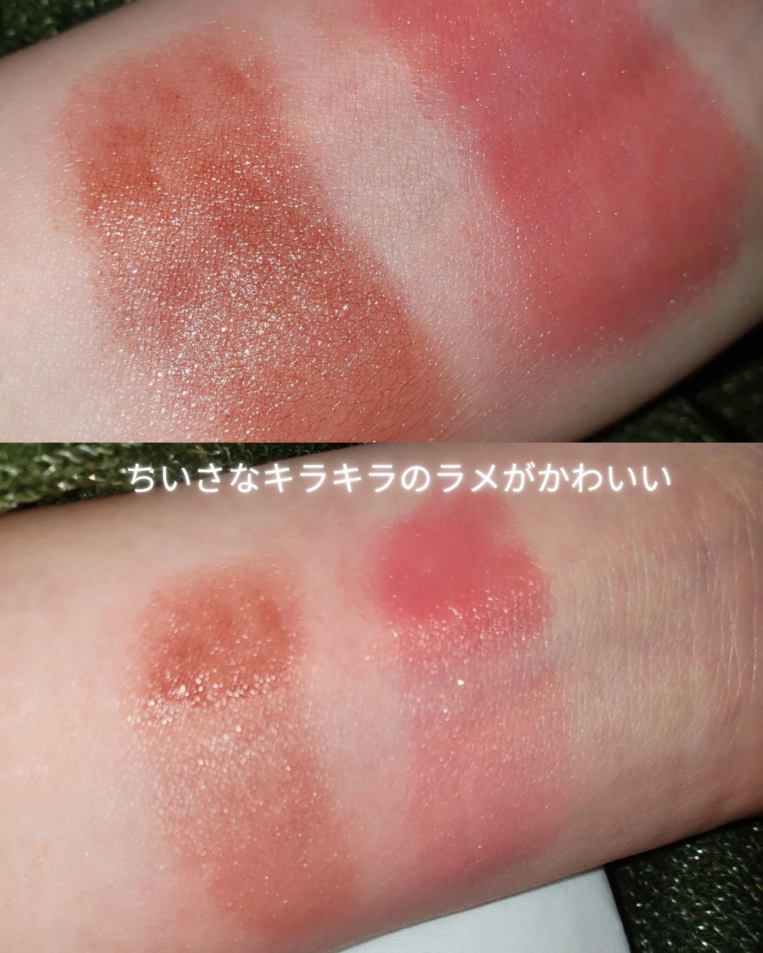 粉質が軽く塗りやすい むらになりにくい グラデーションが作りやすい くすんだローズカラーがかわいい ざくざくのラメで華やかに上品になれる ラメを使わずに、おとなしい印象にもなれる ラメが大粒なので擦れには弱い(ラメ落ち) チップが付属されていない