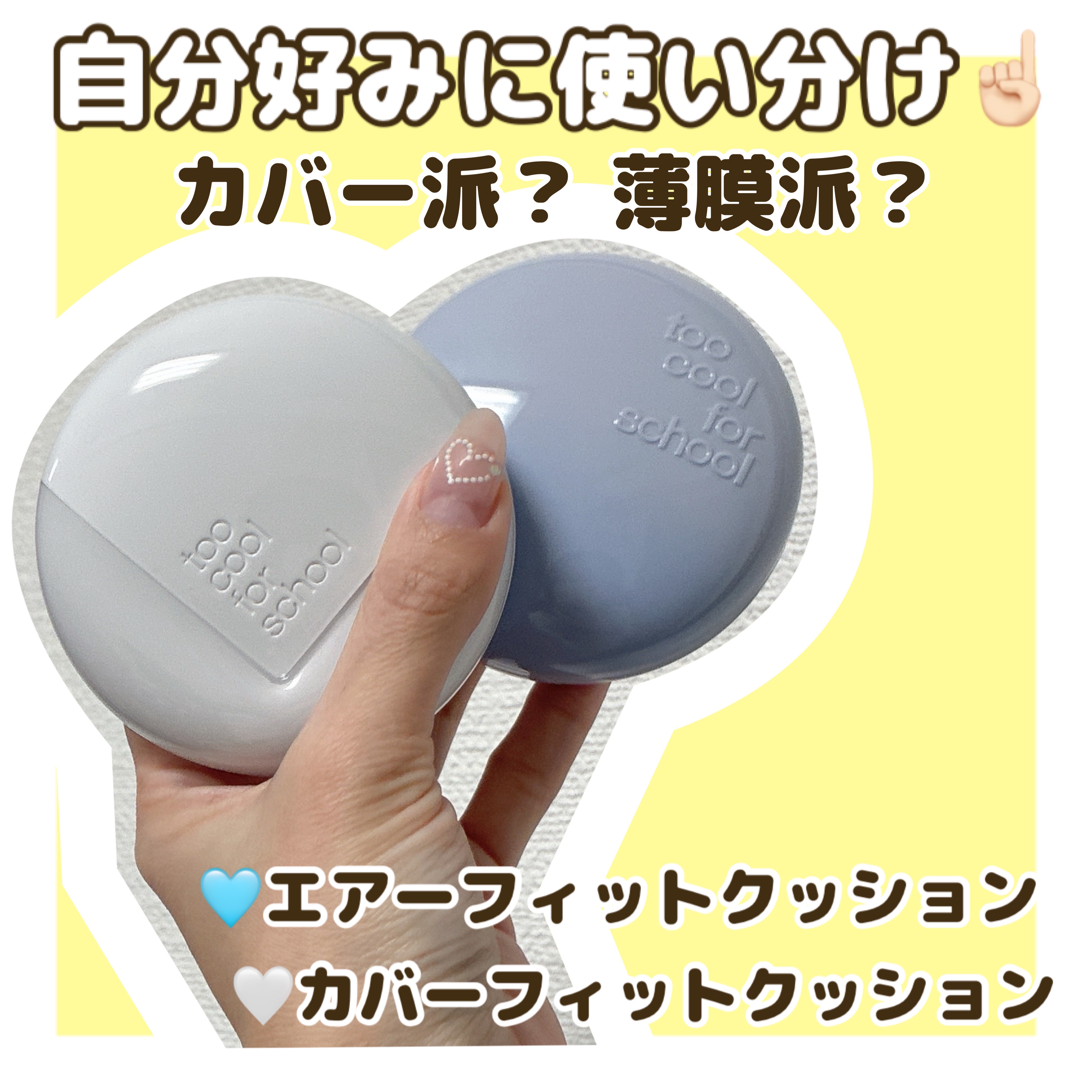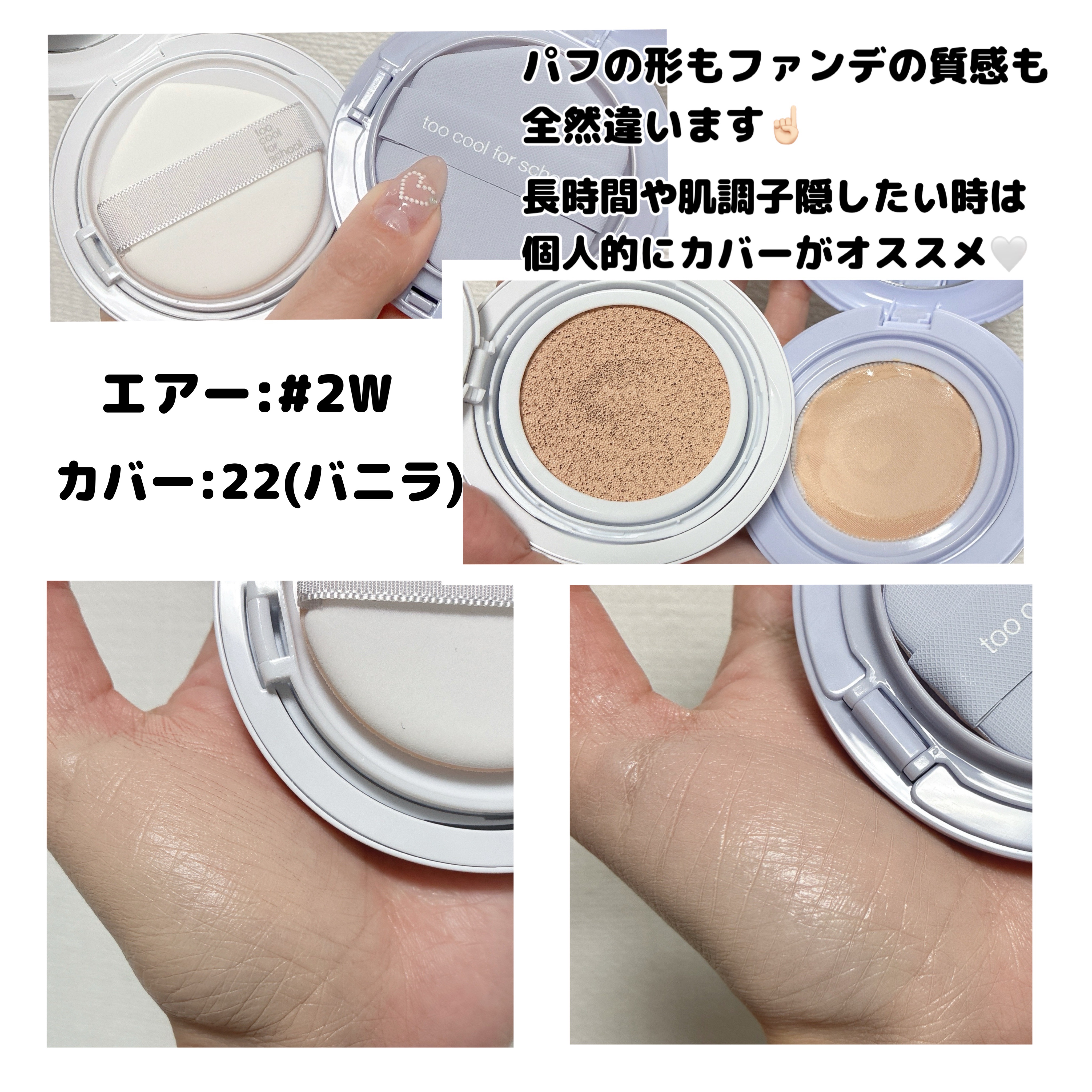 toocoolforschoolエアーフィットクッション✨オリーブヤングで人気の新作クッションファンデが、Qoo10にて日本先行発売開始!全4色展開で、使用カラーは「2WWarmIvory」!淡いブルーカラーのコンパクトで、ころんとしたデザイ...