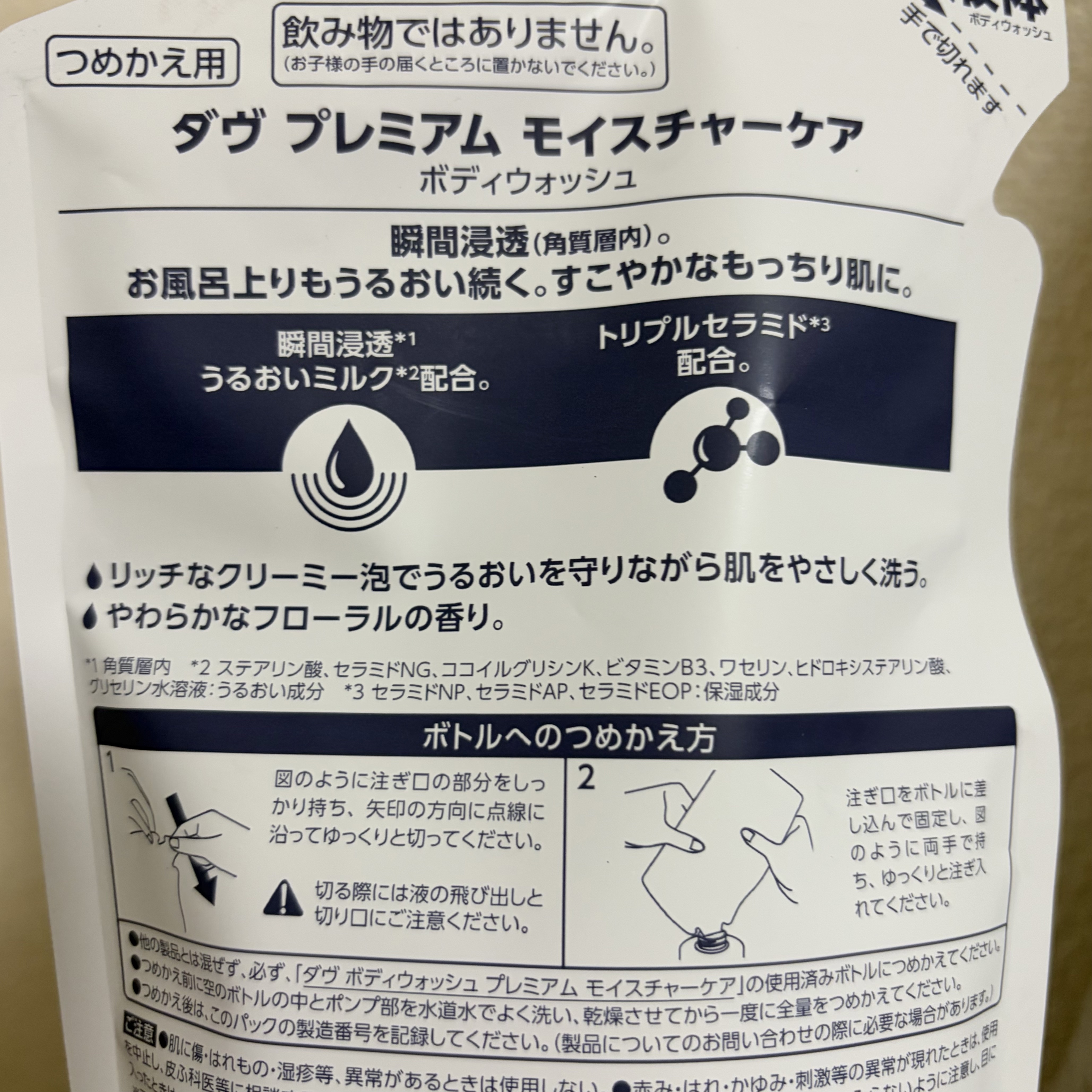 - 2023年10月2日(月)より全国でリニューアル発売 ●瞬間浸透(*1)うるおいミルク(*2)配合。 ●お風呂上りもうるおい続く。すこやかでもっちりとした質感の肌に。リッチなクリーミー泡でうるおいを守りながら肌をやさしい使い心地で洗う。 ●トリプルセラミド(*3)新配合。 *1…角質層内 *2…ステアリン酸、セラミドNG、ココイルグリシンK、ビタミンB3、ワセリン、ヒドロキシステアリン酸、グリセリン水溶液・うるおい成分 *3…セラミドNP、セラミドAP、セラミドEOP・保湿成分