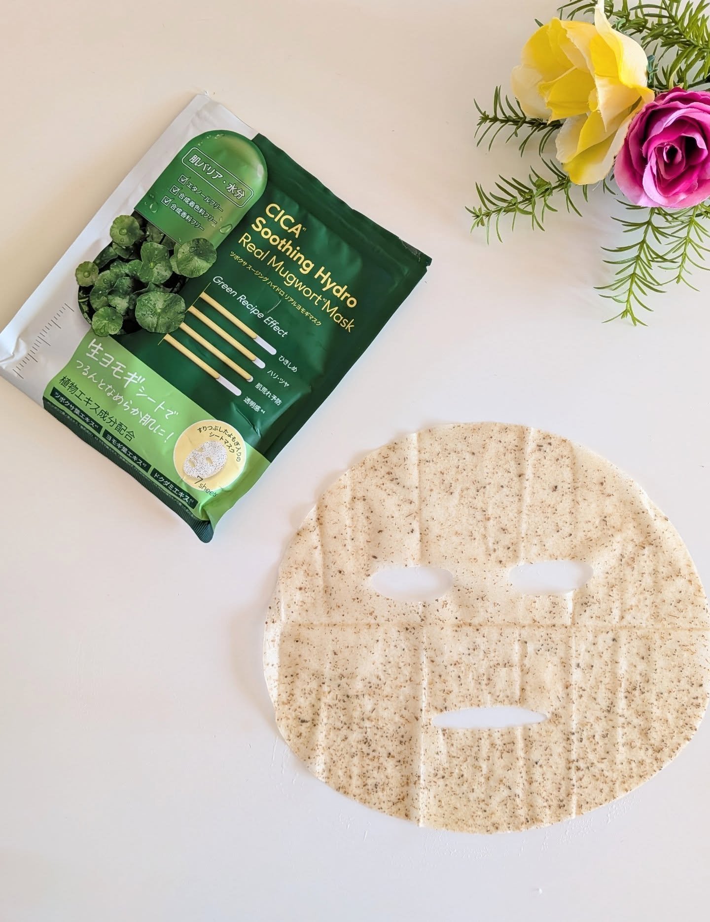 - ハーブエキス*×生ヨモギ*シートでゆらぎがちな肌を整え潤いあるツヤ肌へ。 乾燥や肌荒れを防いで肌を整える自然由来のハーブエキスを14種類配合。 また保湿や肌ひきしめ・整肌作用が期待できることからハーブの女王とも呼ばれるヨモギの葉をすりつぶし、たっぷりと混ぜ込んだオリジナルシートとともに乱れやすい肌環境を整え、潤いたっぷりと補給します。 *保湿成分
