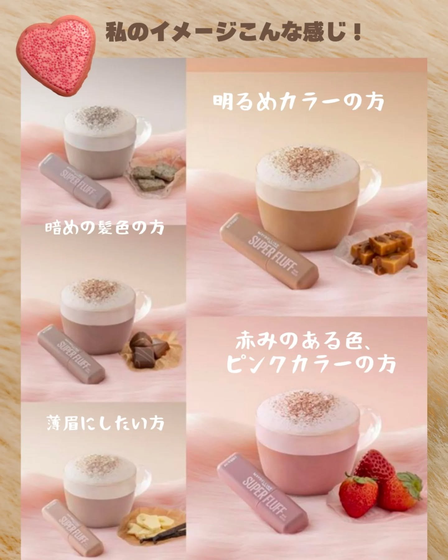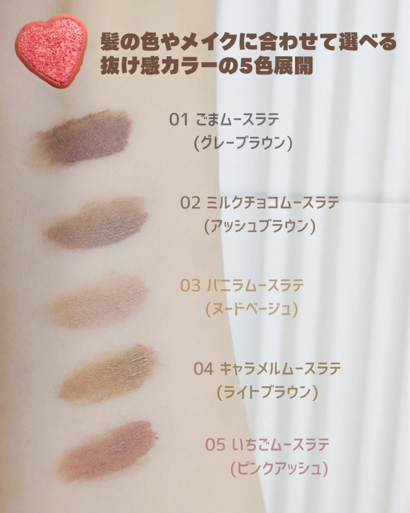 - \NO MORE パリパリ眉!/ 1日*ずっと、ほわっふわ眉。ムラなく色づき、黒眉ミュート ★商品特徴 ①エアリームーステクスチャー 空気とパウダーを混ぜて泡立てたような、軽やかなホイップムーステクスチャーだから、 べったりつかず、固くならない。ふわふわ仕上がり24時間*つづく。 ②テク要らずミニブラシ 先端に向かって細くなるブラシが、細かい毛も余さずキャッチするから、眉頭から眉尻まで均一にムラなく塗れる。 ③全5色展開 なりたい印象に合わせて選べる5色展開。 自眉の黒を消して存在感を抑えたい方にも、髪色に合わせた自然な眉にしたい方にも。 ★カラー展開 -ピンクアッシュ :いちごムースラテ -ライトブラウン :キャラメルムースラテ -ヌードベージュ :バニラムースラテ -アッシュブラウン:ミルクチョコムースラテ -グレーブラウン :ごまムースラテ * メイベリンニューヨーク調べ。個人差があります。