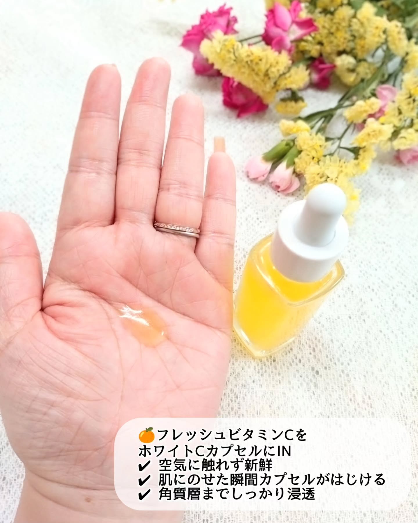 - 美容成分を追求し、たどり着いたフルーツの力とビタミンCの力。 その力を凝縮し誕生した1本4役のビタミンC美容液。 壊れやすいビタミンC*を、独自処方の『ホワイトCカプセル*』でギュッと閉じ込めました。 肌に触れた瞬間カプセルがはじけ新鮮なビタミンC*が肌に広がります。 さらに、厳選のフルーツエキスが肌に潤いを与え透明感あふれる肌に導きます。 1本で「化粧液×美容液×オイル×乳液」の4つの機能。 天然のフルーツアロマの芳醇な香りでスキンケアの時間が癒しの時間に。 *整肌成分