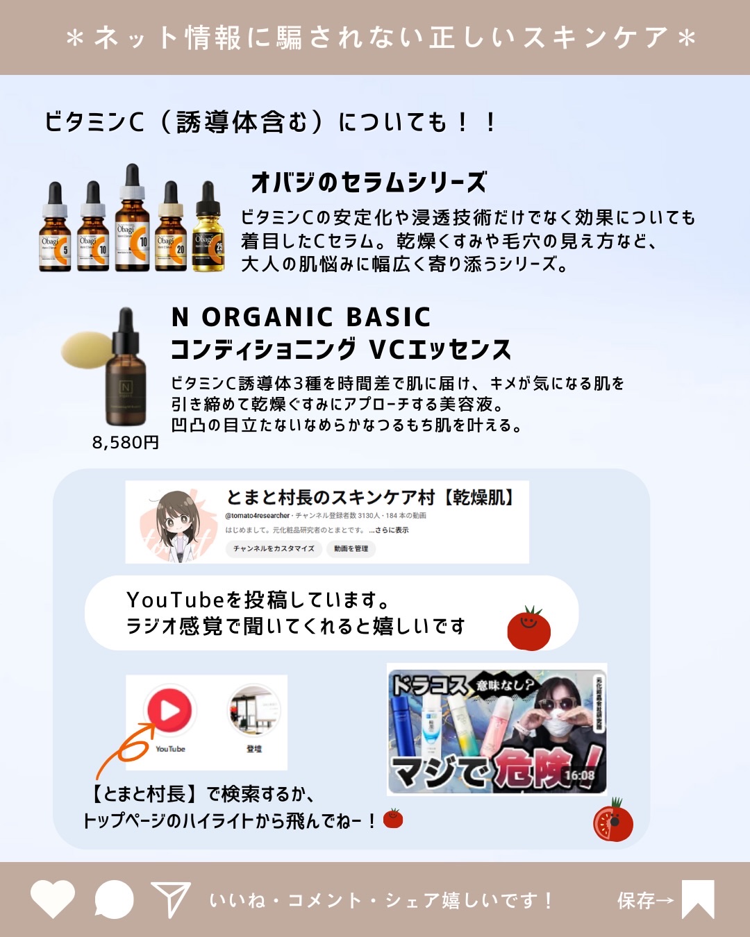 肌が荒れた時にビタミンCがいいとSNSで見かけたというフォロワーさんがいたけど、これは本当に辞めてほしい(濃度にもよるけど) ビタミンCは攻めのケアでもあるから、肌が敏感な時には避けてほしい。 でも、メラニン予防とか毛穴ケアには本当に良い商品でもあると思うから、使い方を間違えずに選択してほしいな!!