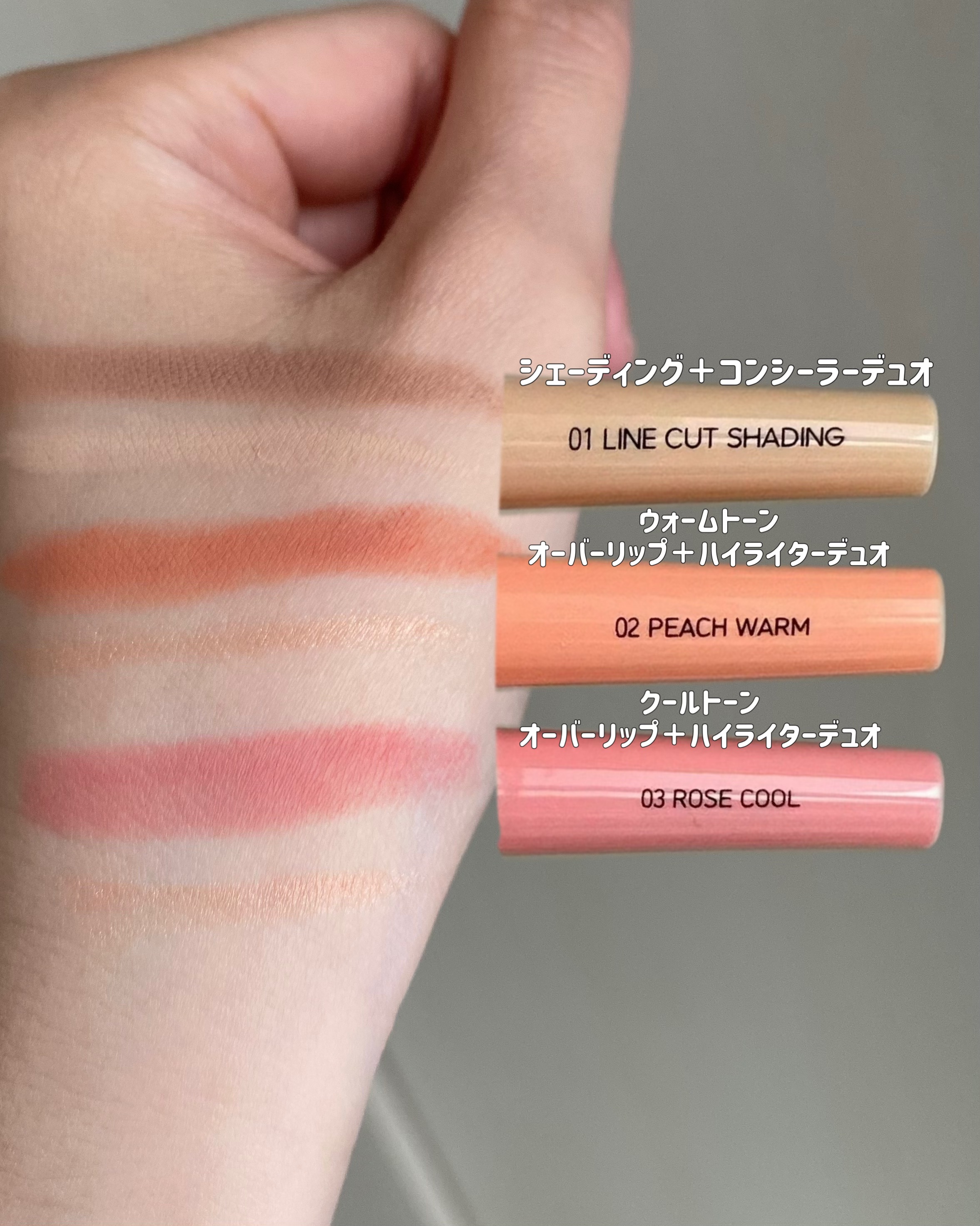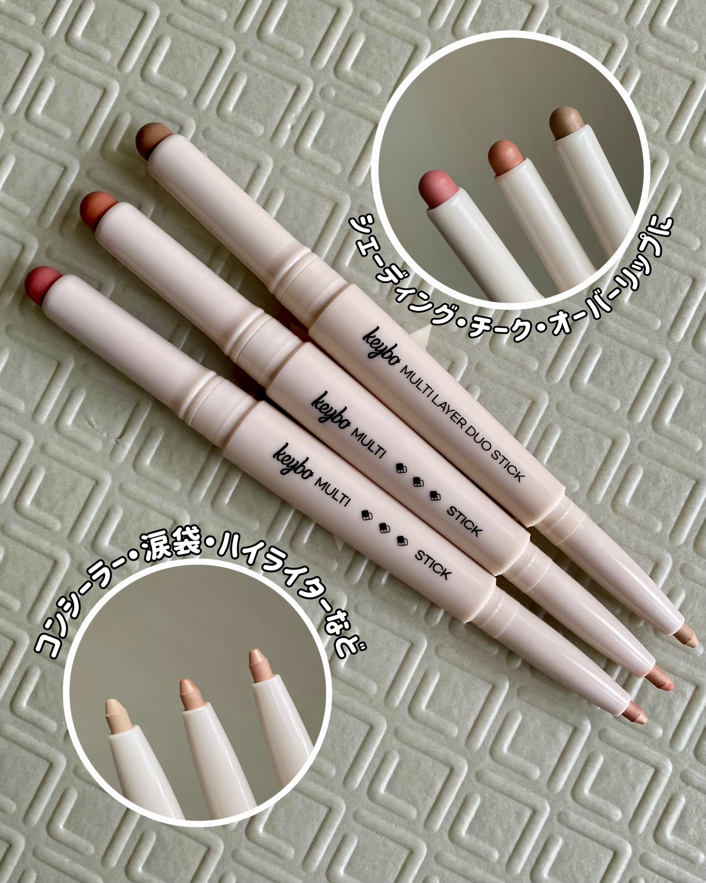 キボコスメティックマルチレイヤーデュオスティック01.ラインカットシェーディング03.ローズクールデュオ+もちミニパフ@keybo_cosmetic@keybo_jpリップベース、涙袋、チーク、コントゥアリング、コンシーラーまで一枚レイヤーで...