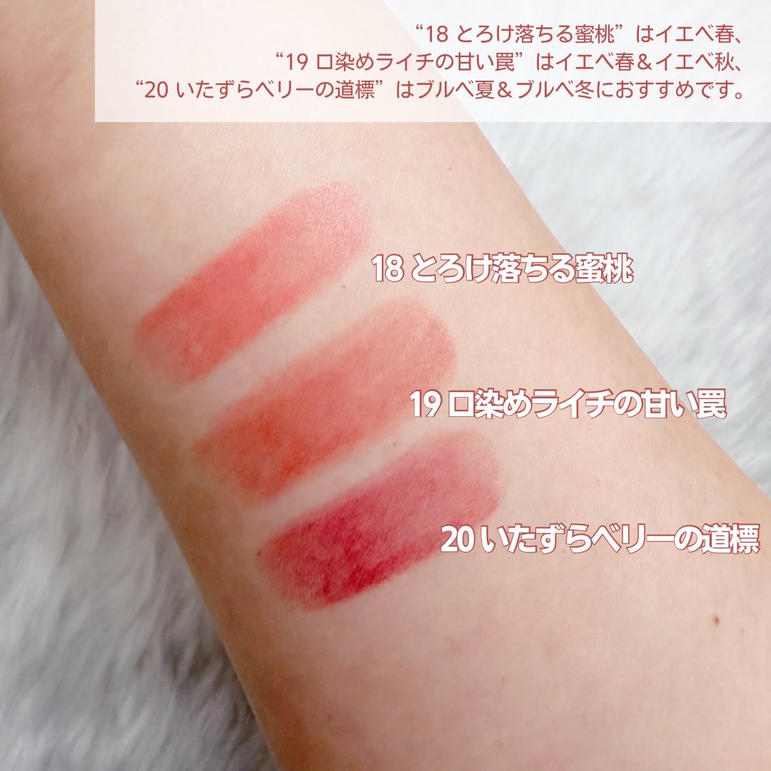 □KATEリップモンスター ¥1,540〜1/24〜3色新作が発売っ!!!18とろけ落ちる蜜桃イエベ春、ブルベ夏に人気!19口染めライチの甘い罠イエベ春に人気!20いたずらベリーの道標ブルベ冬、イエベ春に人気!#KAT...