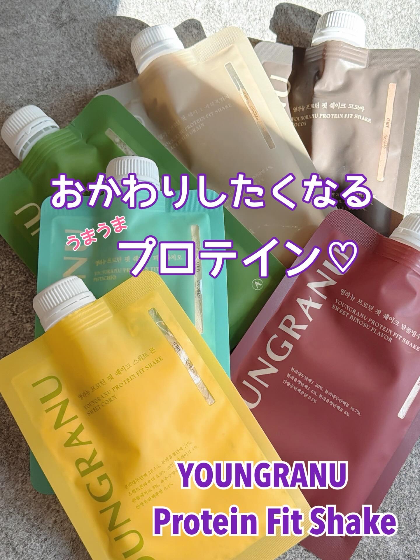 🏷︎⸝⋆PR美味しくヨンラニューチャレンジ🥤𓈒𓂂𓏸YOUNGRANUプロテインフィットシェイク🥤あずきピンス・穀物黒ゴマ・よもぎラテ・ピスタチオ・ココア・スイートコーンの全6種類水や牛乳、豆乳を目盛...