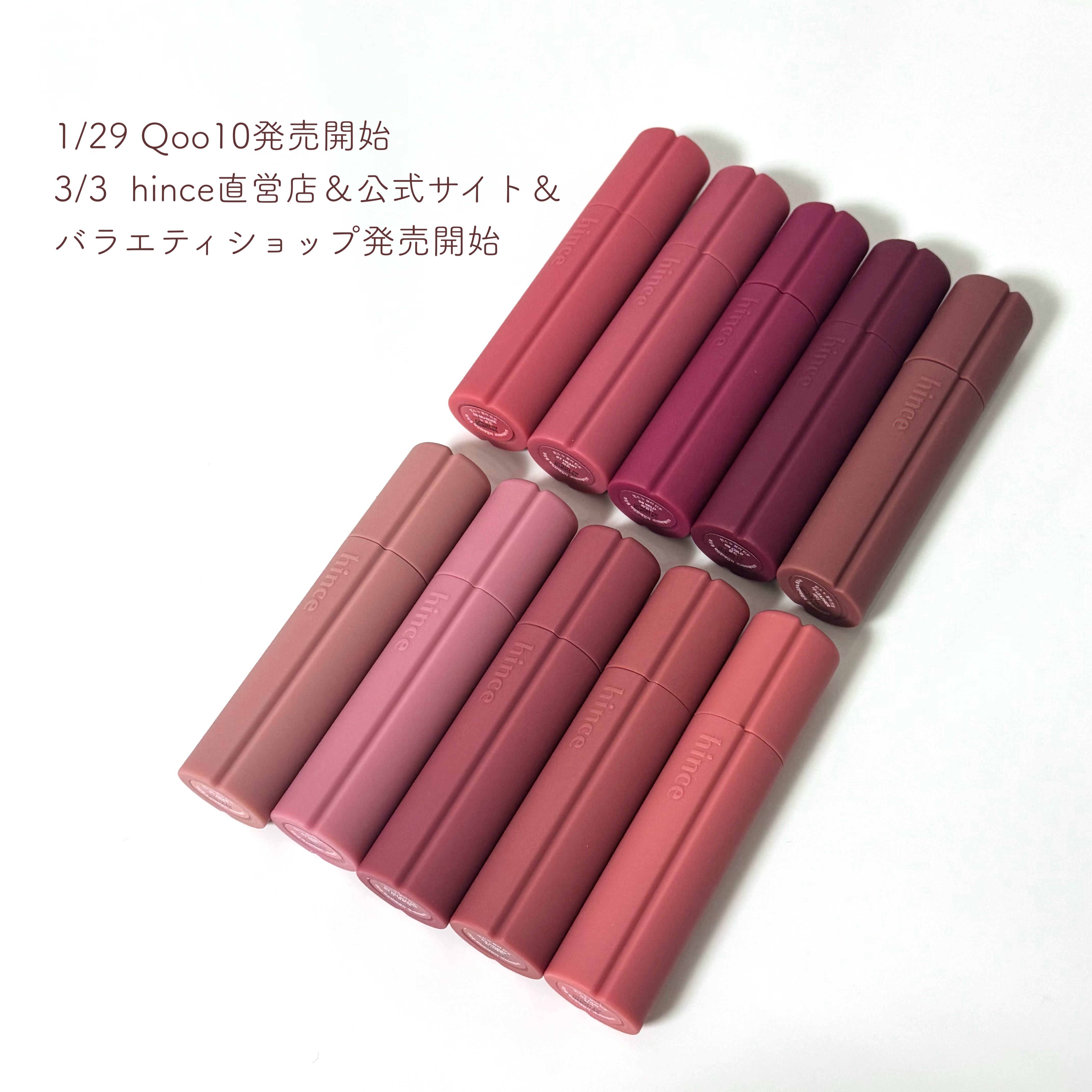 - POINT 1.ひと塗りでふわっと広がり、ピタッと密着 軽やかな一塗りで唇の上に均一にのび広がり、 乾燥感のない心地よさを保ちながらフィットするホイップクリームテクスチャー。 POINT 2.なめらかにとろけ、角質浮きを感じさせないクリームフォーム処方 “Um-pah”する瞬間、唇の上からやさしくなじみ、 角質浮きや乾燥を感じさせず、快適な仕上がりをキープします。 POINT 3.半透明ブラー処方によるソフトフォーカス効果 半透明のブラー処方が、唇の縦ジワまでふんわり補整。 ソフトフォーカスをかけたような、なめらかで洗練された印象を演出します。 POINT 4.パーソナルカラーに寄り添うBARE TO BOLDカラースペクトラム 毎日使いやすいベアカラーから、印象を引き締めるボールドカラーまで、 幅広いメイクを楽しめる全10色のカラー展開。 ■ Texture やわらかく溶けるようになめらかに広がる、 ホイップクリームのような新感触のクリーミーマットテクスチャー。 ■ 先行発売 • 2026年1月29日(木)|先行発売 Qoo10公式ショップ • 2026年2月19日(木) 楽天市場公式ショップ ■一般発売 2026年3月3日(火) 直営店(hince ルミネエスト新宿店/ルクア イーレ店/タカシマヤ ゲートタワーモール店)、公式オンラインストア(hince.jp)、全国バラエティショップにて一般発売 ※【事前予約】2月25日より、直営店3店舗および公式オンラインストア限定で、事前予約を実施予定です。 ※【取扱いについて】順次発売、店舗の事情により一部取り扱いのない場合がございます。