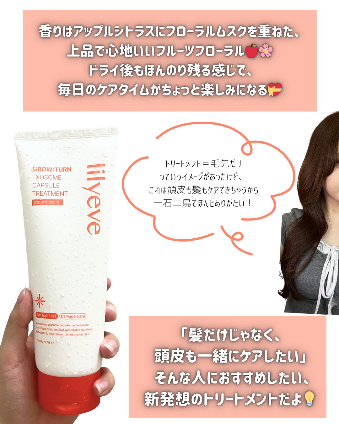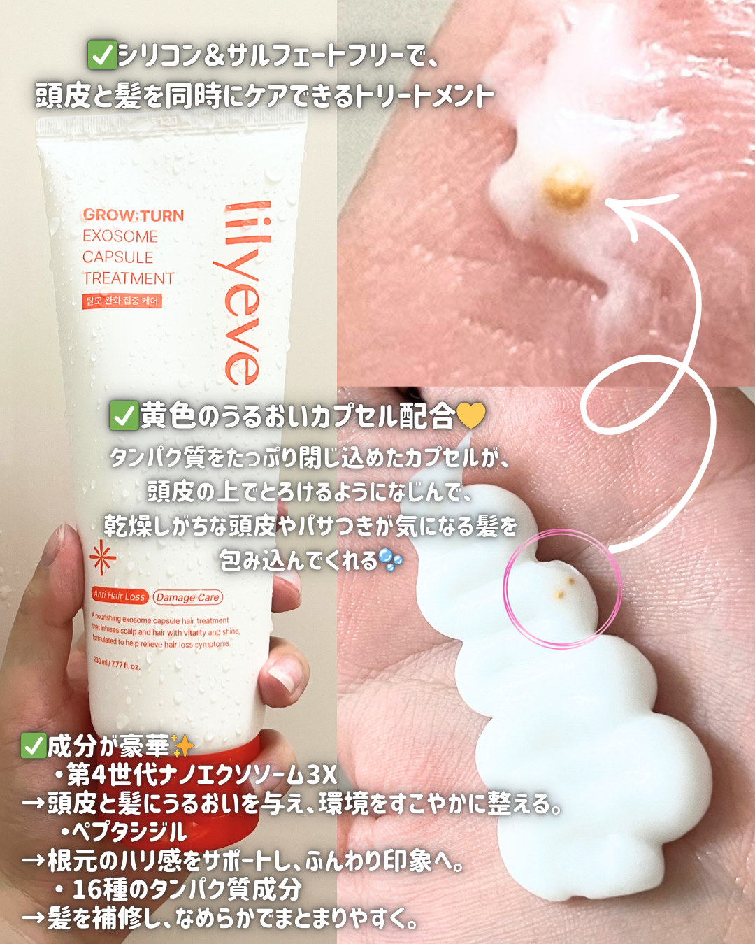 頭皮に直接塗れる新感覚のカプセル処方!lilyeveのカプセルトリートメントは、3分置くだけで根元はふんわり、毛先はちゅるんとした指通りに✨パサつきが気になる私の髪も、使うたびにツヤ感UPして感動…。自宅で手軽に贅沢スカルプケアができるから手...