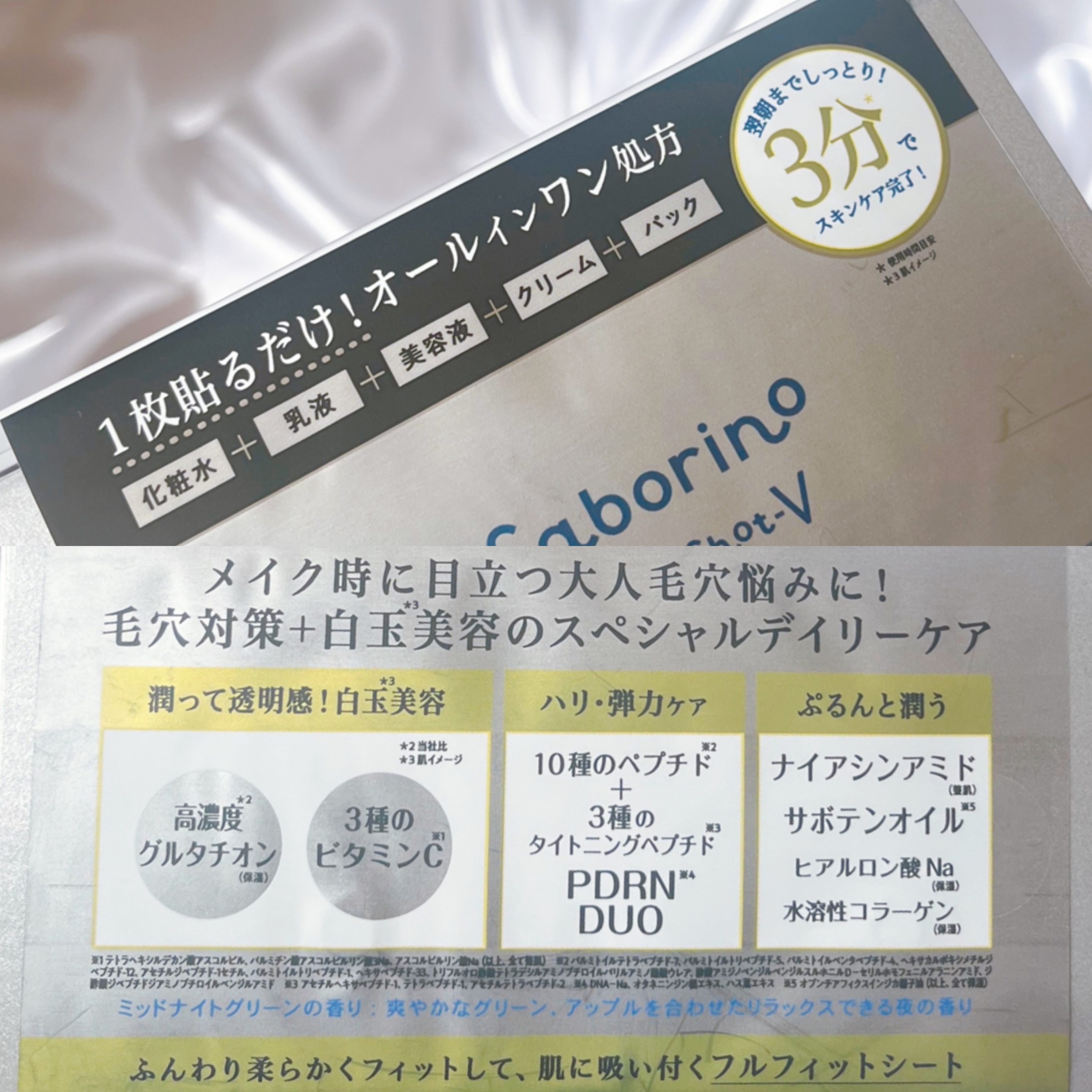 朝☀️夜🌃時短スキンケアできちゃうマスク😍💗🦋.*˚☺︎サボリーノ♥サボリーノメガショット┊︎朝用ツヤピールマスクCC┊︎夜用白玉美容マスクどちらも美容液を含みやすいふんわり極フルフィットシートを採用されていてシートが伸ばしやすくフィットする...