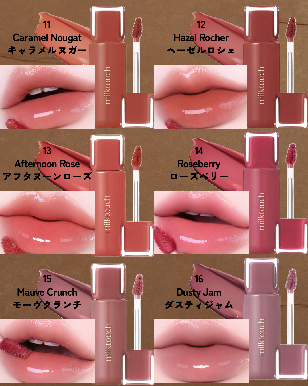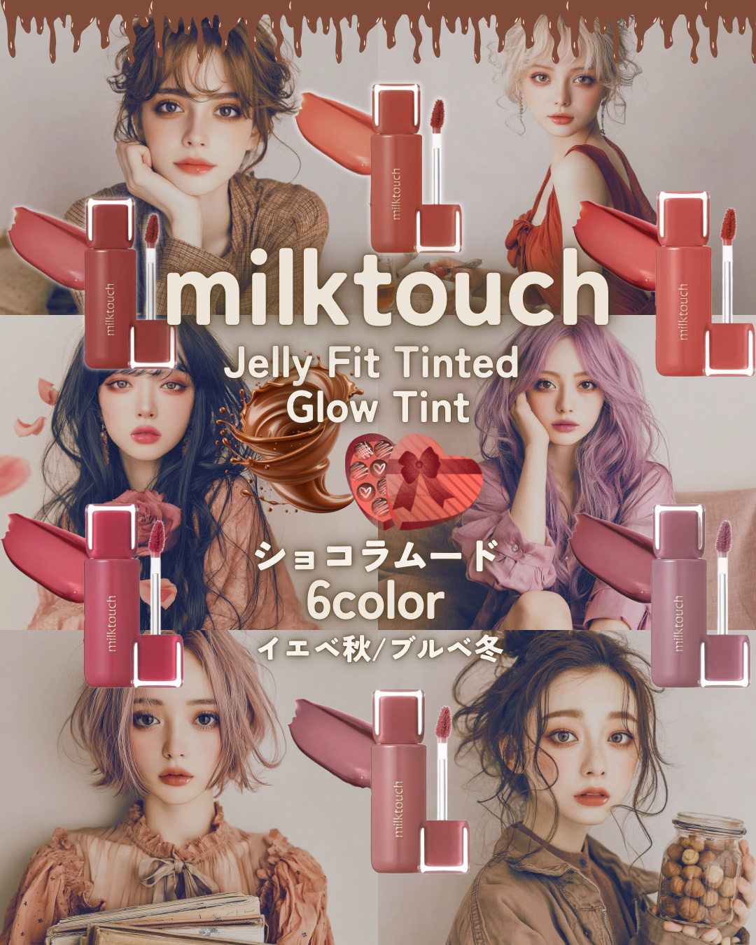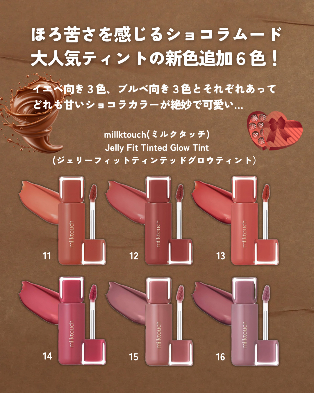 milktouchジェリーフィットティンティッドグロウティントショコラシリーズ新6色紹介🍫【商品について】こんにゃくゼリーみたいなうるツヤ感のぷるぷるツヤ膜ティント🫧塗って少し時間を置くと綺麗なツヤ膜が浮き上がってきます。マイルドなプラ...