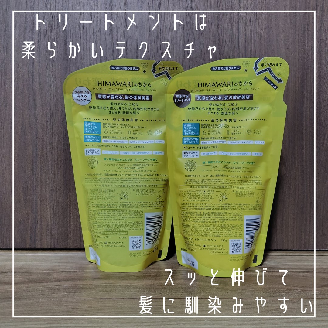 - <シャンプー ポンプ 390ml> 水、ラウラミドプロピルベタイン、ラウロイルメチルアラニンNa、イソペンチルジオール、ココイルグルタミン酸TEA、ヤシ油脂肪酸PEG-7グリセリル、ジラウラミドグルタミドリシンNa、ヒマワリ種子油脂肪酸フィトステリル、グリセリン、ヒマワリ種子油、ヒマワリ種子エキス、ヒマワリ花エキス、ポリクオタニウム-7、ポリクオタニウム-22、クエン酸、ラウリン酸PEG-2、ポリクオタニウム-10、セテアレス-60ミリスチルグリコール、グアーヒドロキシプロピルトリモニウムクロリド、ピロ亜硫酸Na、塩化Na、BG、EDTA-2Na、安息香酸Na、香料 <トリートメント ポンプ 390g> 水、セテアリルアルコール、ジメチコン、グリセリン、ジラウラミドグルタミドリシンNa、ヒマワリ種子油脂肪酸フィトステリル、ポリクオタニウム-107、ヒマワリ種子油、ヒマワリ種子エキス、ヒマワリ花エキス、PPG-2アルギニン、ミツロウ、乳酸、パラフィン、ビスジグリセリルポリアシルアジペート-2、ベヘナミドプロピルジメチルアミン、DPG、グリコシルトレハロース、水添ポリイソブテン、加水分解水添デンプン、イソプロパノール、(PEG-40/PPG-8メチルアミノプロピル/ヒドロキシプロピルジメチコン)コポリマー、ネオペンタン酸イソデシル、ラウレス-4、ラウレス-23、ステアリン酸PEG-55、クエン酸、BG、ステアルトリモニウムクロリド、安息香酸Na、メチルパラベン、香料、カラメル <シャンプー 詰替用 330ml> 水、ラウラミドプロピルベタイン、ラウロイルメチルアラニンNa、イソペンチルジオール、ココイルグルタミン酸TEA、ヤシ油脂肪酸PEG-7グリセリル、ジラウラミドグルタミドリシンNa、ヒマワリ種子油脂肪酸フィトステリル、グリセリン、ヒマワリ種子油、ヒマワリ種子エキス、ヒマワリ花エキス、ポリクオタニウム-7、ポリクオタニウム-22、クエン酸、ラウリン酸PEG-2、ポリクオタニウム-10、セテアレス-60ミリスチルグリコール、グアーヒドロキシプロピルトリモニウムクロリド、ピロ亜硫酸Na、塩化Na、BG、EDTA-2Na、安息香酸Na、香料 <トリートメント 詰替用 330g> 水、セテアリルアルコール、ジメチコン、グリセリン、ジラウラミドグルタミドリシンNa、ヒマワリ種子油脂肪酸フィトステリル、ポリクオタニウム-107、ヒマワリ種子油、ヒマワリ種子エキス、ヒマワリ花エキス、PPG-2アルギニン、ミツロウ、乳酸、パラフィン、ビスジグリセリルポリアシルアジペート-2、ベヘナミドプロピルジメチルアミン、DPG、グリコシルトレハロース、水添ポリイソブテン、加水分解水添デンプン、イソプロパノール、(PEG-40/PPG-8メチルアミノプロピル/ヒドロキシプロピルジメチコン)コポリマー、ネオペンタン酸イソデシル、ラウレス-4、ラウレス-23、ステアリン酸PEG-55、クエン酸、BG、ステアルトリモニウムクロリド、安息香酸Na、メチルパラベン、香料、カラメル