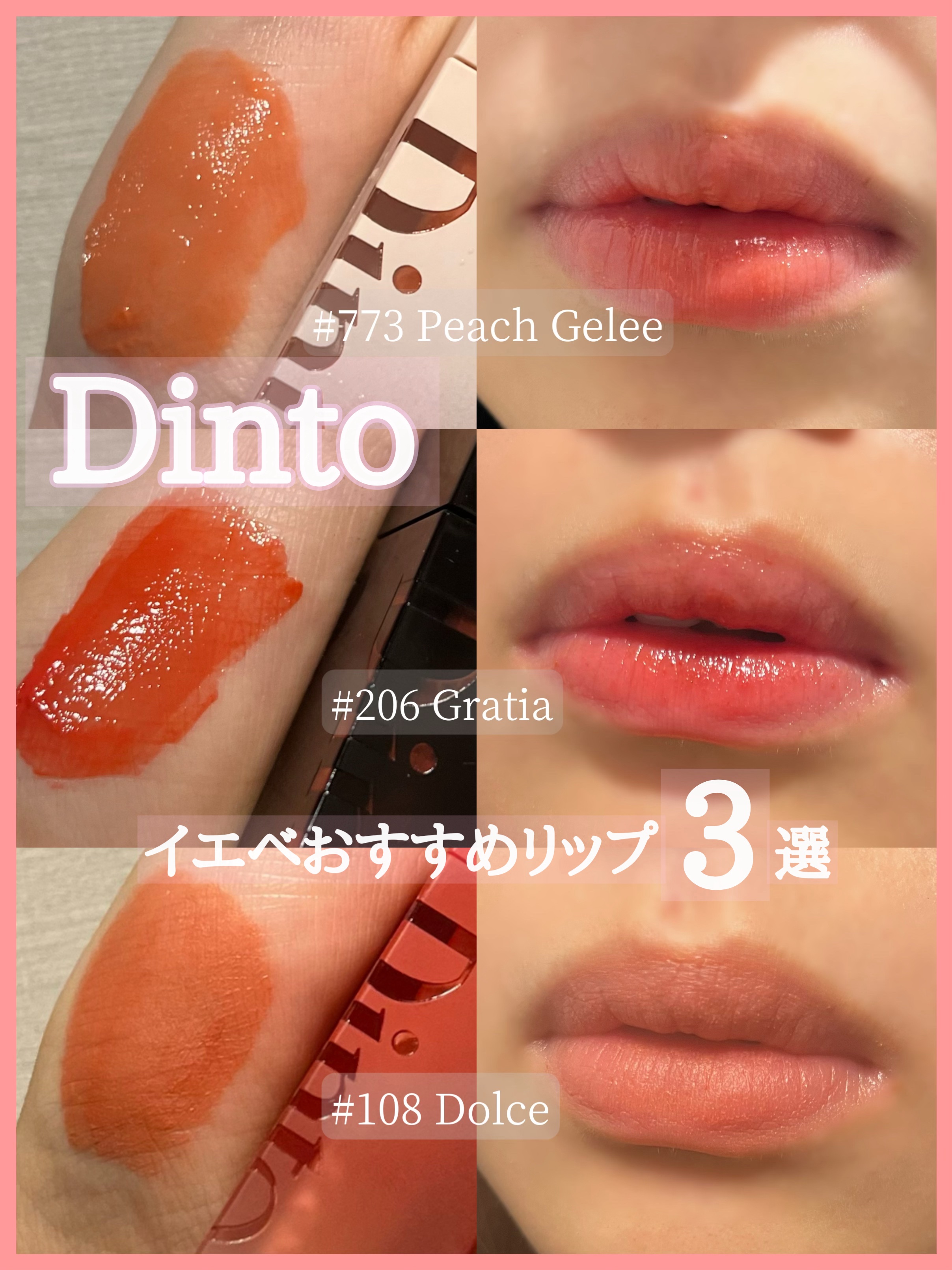 Dintoのイエベリップ3種🌟☑︎PeachGeleeプランパー効果あり!ぷるんと幸福度高めなコーラルカラーが可愛い💛☑︎Gratiaガラス玉のような艶ティント🔮洗浄力弱めクレンジングでは落ちない!☑︎Dolceスフレっぽい質感🫧すっぴん風メ...