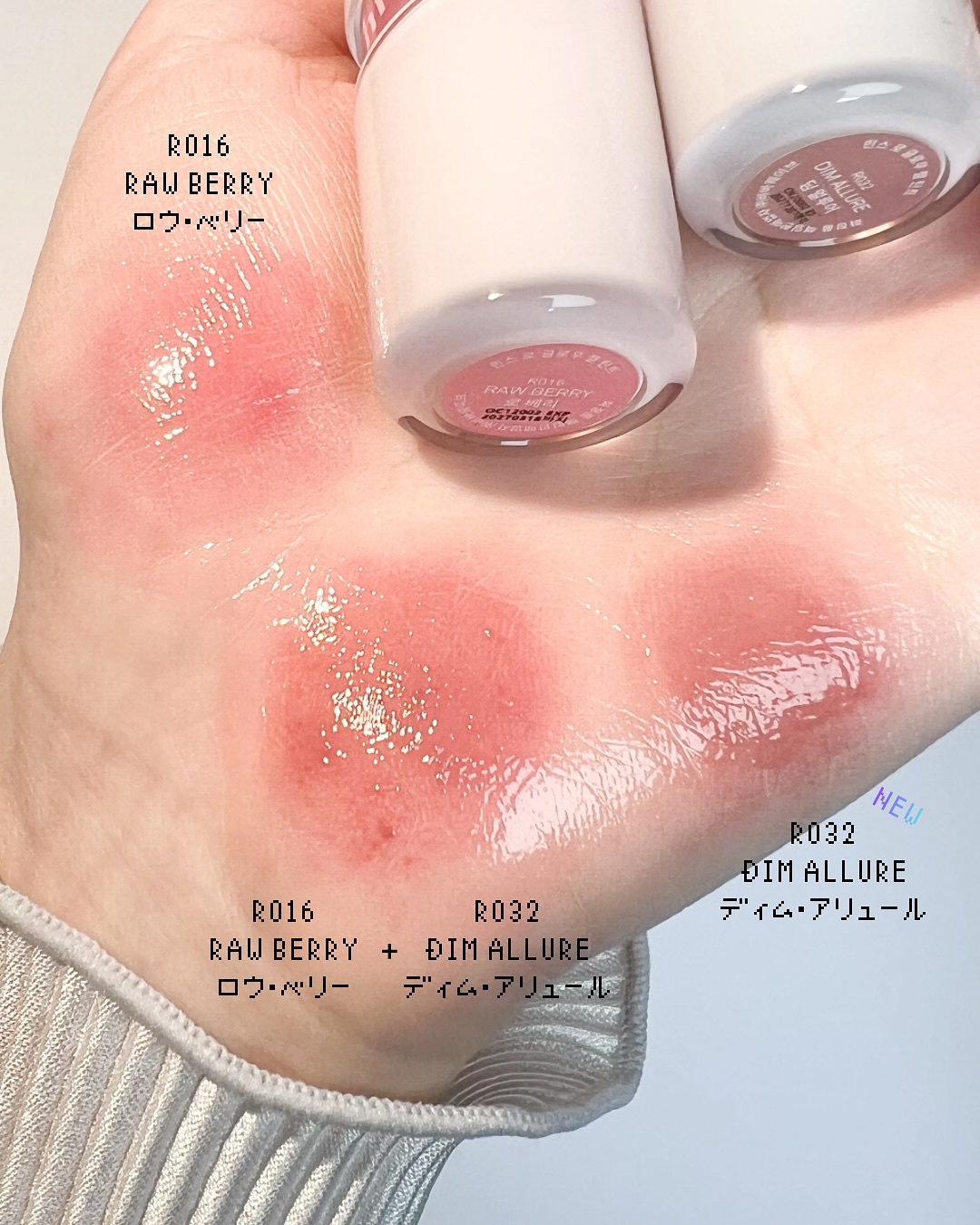 - <R001 ベア> 水、ジフェニルジメチコン、オクチルドデカノール、ビスジグリセリルポリアシルアジペート-2、リンゴ酸ジイソステアリル、トリメチルシロキシフェニルジメチコン、水添ポリイソブテン、ジグリセリン、ポリソルベート60、BG、セチルPEG/PPG-10/1ジメチコン、1,2-ヘキサンジオール、ペンチレングリコール、(アクリル酸ヒドロキシエチル/アクリロイルジメチルタウリンNa)コポリマー、セテアレス-20、スクワラン、フェノキシエタノール、酸化チタン、香料、エチルヘキシルグリセリン、黄5、赤227、イソステアリン酸ソルビタン、水酸化Al、ポリアクリル酸アンモニウム、酢酸トコフェロール、黄4、青1、ヒアルロン酸Na、(アルギニン/リシン)ポリペプチド、加水分解ヒアルロン酸、トコフェロール、アセチルヒアルロン酸Na、ソルビン酸 <R002 ロウローズ> 水、ジフェニルジメチコン、オクチルドデカノール、ビスジグリセリルポリアシルアジペート-2、リンゴ酸ジイソステアリル、トリメチルシロキシフェニルジメチコン、水添ポリイソブテン、ジグリセリン、ポリソルベート60、BG、セチルPEG/PPG-10/1ジメチコン、1,2-ヘキサンジオール、ペンチレングリコール、(アクリル酸ヒドロキシエチル/アクリロイルジメチルタウリンNa)コポリマー、セテアレス-20、スクワラン、フェノキシエタノール、酸化チタン、香料、エチルヘキシルグリセリン、黄5、赤227、イソステアリン酸ソルビタン、酢酸トコフェロール、水酸化Al、ポリアクリル酸アンモニウム、ヒアルロン酸Na、青1、加水分解ヒアルロン酸、(アルギニン/リシン)ポリペプチド、トコフェロール、アセチルヒアルロン酸Na、ソルビン酸 <R003 ロウプリコット> 水、ジフェニルジメチコン、オクチルドデカノール、ビスジグリセリルポリアシルアジペート-2、リンゴ酸ジイソステアリル、トリメチルシロキシフェニルジメチコン、水添ポリイソブテン、ジグリセリン、ポリソルベート60、BG、セチルPEG/PPG-10/1ジメチコン、1,2-ヘキサンジオール、ペンチレングリコール、(アクリル酸ヒドロキシエチル/アクリロイルジメチルタウリンNa)コポリマー、セテアレス-20、スクワラン、フェノキシエタノール、香料、エチルヘキシルグリセリン、酸化チタン、黄5、イソステアリン酸ソルビタン、赤227、酢酸トコフェロール、ヒアルロン酸Na、水酸化Al、ポリアクリル酸アンモニウム、加水分解ヒアルロン酸、青1、(アルギニン/リシン)ポリペプチド、トコフェロール、アセチルヒアルロン酸Na、ソルビン酸 <R004 フィーバー> 水、ジフェニルジメチコン、オクチルドデカノール、リンゴ酸ジイソステアリル、ビスジグリセリルポリアシルアジペート-2、トリメチルシロキシフェニルジメチコン、水添ポリイソブテン、ジグリセリン、ポリソルベート60、BG、セチルPEG/PPG-10/1ジメチコン、1,2-ヘキサンジオール、ペンチレングリコール、(アクリル酸ヒドロキシエチル/アクリロイルジメチルタウリンNa)コポリマー、セテアレス-20、スクワラン、フェノキシエタノール、香料、エチルヘキシルグリセリン、黄5、赤227、イソステアリン酸ソルビタン、酢酸トコフェロール、ヒアルロン酸Na、加水分解ヒアルロン酸、(アルギニン/リシン)ポリペプチド、トコフェロール、アセチルヒアルロン酸Na、ソルビン酸 <R005 ハイビスカス> 水、ジフェニルジメチコン、オクチルドデカノール、ビスジグリセリルポリアシルアジペート-2、リンゴ酸ジイソステアリル、トリメチルシロキシフェニルジメチコン、水添ポリイソブテン、ジグリセリン、ポリソルベート60、BG、セチルPEG/PPG-10/1ジメチコン、1,2-ヘキサンジオール、ペンチレングリコール、アクリル酸ヒドロキシエチル/アクリロイルジメチルタウリンNa)コポリマー、セテアレス-20、スクワラン、フェノキシエタノール、香料、エチルヘキシルグリセリン、赤227、黄5、イソステアリン酸ソルビタン、赤104(1)、酢酸トコフェロール、ヒアルロン酸Na、加水分解ヒアルロン酸、(アルギニン/リシン)ポリペプチド、トコフェロール、アセチルヒアルロン酸Na、ソルビン酸 <R006 ロウグレープ> 水、ジフェニルジメチコン、ビスジグリセリルポリアシルアジペート-2、リンゴ酸ジイソステアリル、オクチルドデカノール、トリメチルシロキシフェニルジメチコン、水添ポリイソブテン、ジグリセリン、ポリソルベート60、BG、セチルPEG/PPG-10/1ジメチコン、1,2-ヘキサンジオール、ペンチレングリコール、(アクリル酸ヒドロキシエチル/アクリロイルジメチルタウリンNa)コポリマー、セテアレス-20、スクワラン、酸化チタン、フェノキシエタノール、香料、エチルヘキシルグリセリン、黄5、赤227、イソステアリン酸ソルビタン、水酸化Al、ポリアクリル酸アンモニウム、酢酸トコフェロール、ヒアルロン酸Na、青1、加水分解ヒアルロン酸、(アルギニン/リシン)ポリペプチド、トコフェロール、アセチルヒアルロン酸Na、ソルビン酸 <R007 チル> 水、ジフェニルジメチコン、オクチルドデカノール、ビスジ