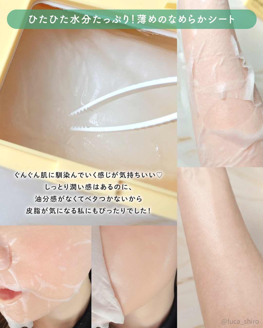 マスクをつけた後、毛穴がふっくらして肌が滑らかになっているのを感じました。すごい! キメが整って肌ツヤツヤです。 すごく柔らかくて肌にぴったり密着するシートなので肌内部へしっかり浸透している感じ。 翌朝の肌の水分量を測ってみましたがいつもより多かったです。 伸縮するシートなので肌を持ち上げるようにつける事でなんとなくリフトアップした気もします。 肌の赤みがあっても痛みやかゆみがないのも嬉しい。 これは自分でも買おうと思います。めちゃくちゃ気に入りました!