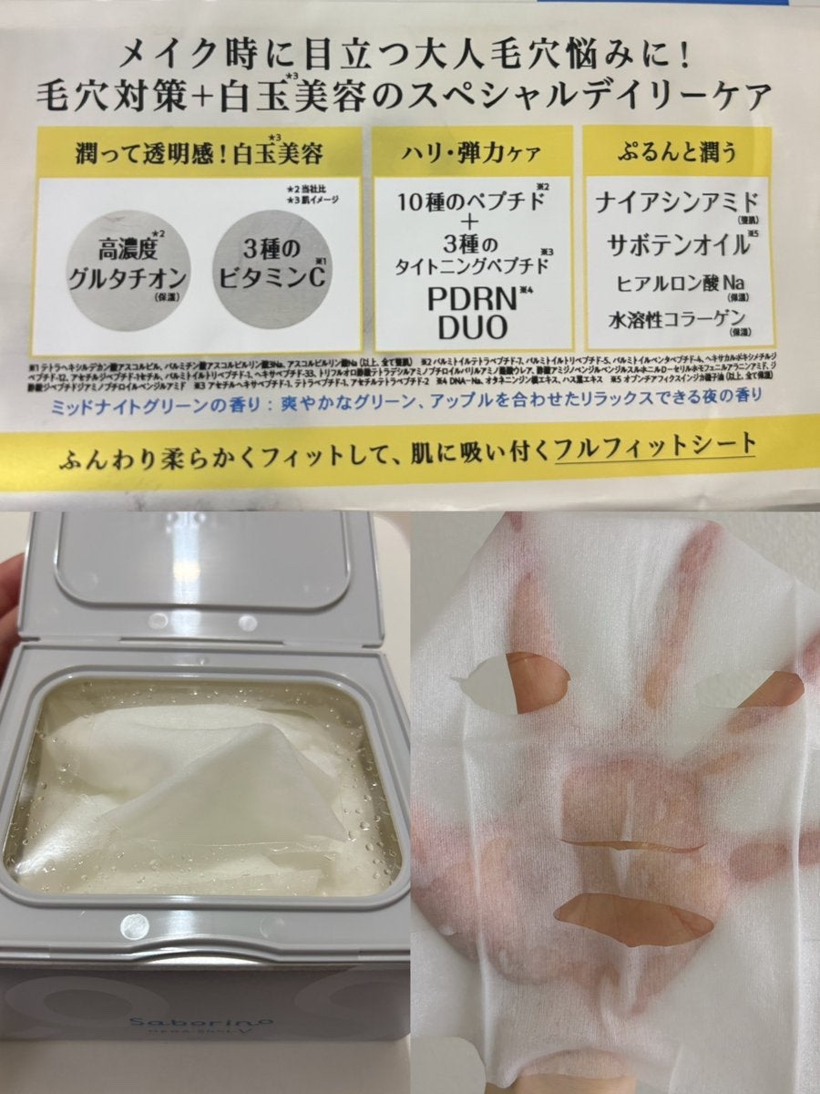 - メイク時に目立つ毛穴悩みに、毛穴対策+白玉*¹美容のスペシャルなデイリーケア。おやすみ前のお手入れはこれ1枚で完了!オールインワン処方の夜用マスク。 リッチな潤い成分配合で肌に美しい透明感。 【高濃度*²グルタチオン(保湿)】アミノ酸からなる成分で、美しく透明感のある肌に 【3種のビタミンC*³】 毛穴ゆるみをキュッとタイトニングしてもっちり肌。 毛穴の目立ちにくいハリと弾力のあるもっちり肌へと導きます。 【10種のペプチド】 ・パルミトイルテトラペプチド-7 ・パルミトイルトリペプチド-5 ・パルミトイルペンタペプチド-4 ・ヘキサカルボキシメチルジペプチド-12 ・アセチルジペプチド-1セチル ・パルミトイルトリペプチド-1 ・ヘキサペプチド-33 ・トリフルオロ酢酸テトラデシルアミノブチロイルバリルアミノ酪酸ウレア ・酢酸アミジノベンジルベンジルスルホニルD-セリルホモフェニルアラニンアミド ・ジ酢酸ジペプチドジアミノブチロイルベンジルアミド 【3種のタイトニングペプチド】 ・アセチルヘキサペプチド-1 ・テトラペプチド-1 ・アセチルテトラペプチド-2 【PDRN DUO】 ・DNA-Na ・オタネニンジン根エキス ・ハス葉エキス(以上、全て保湿) ナイアシンアミド配合で、肌のベースからアプローチ。 たっぷりの保湿成分とナイアシンアミド(整肌成分)を配合。 肌を内側からぷるんと白玉*¹肌へと整えます。 ・ナイアシンアミド(整肌) ・サボテンオイル*⁴ ・ヒアルロン酸Na(保湿) ・水溶性コラーゲン(保湿) 1枚貼るだけ!オールインワン処方 化粧水+乳液+美容液+クリーム+パック <小鼻を包み込むサボリーノオリジナルシートマスク> 液含みの良いシートで、肌あたりも優しくたっぷりひたひたの使い心地です。 サイドの切れ込みを持ち上げるように引き上げてお使いください。 ミッドナイトグリーンの香り 爽やかなグリーンの香りにアップルの香りを合わせた、 夜のひとときをリラックスさせてくれる香りです。 *1 肌イメージ *2 当社比 *3 テトラヘキシルデカン酸アスコルビル、パルミチン酸アスコルビルリン酸3Na、アスコルビルリン酸Na(以上、全て整肌) *4 オプンチアフィクスインジカ種子油(保湿)