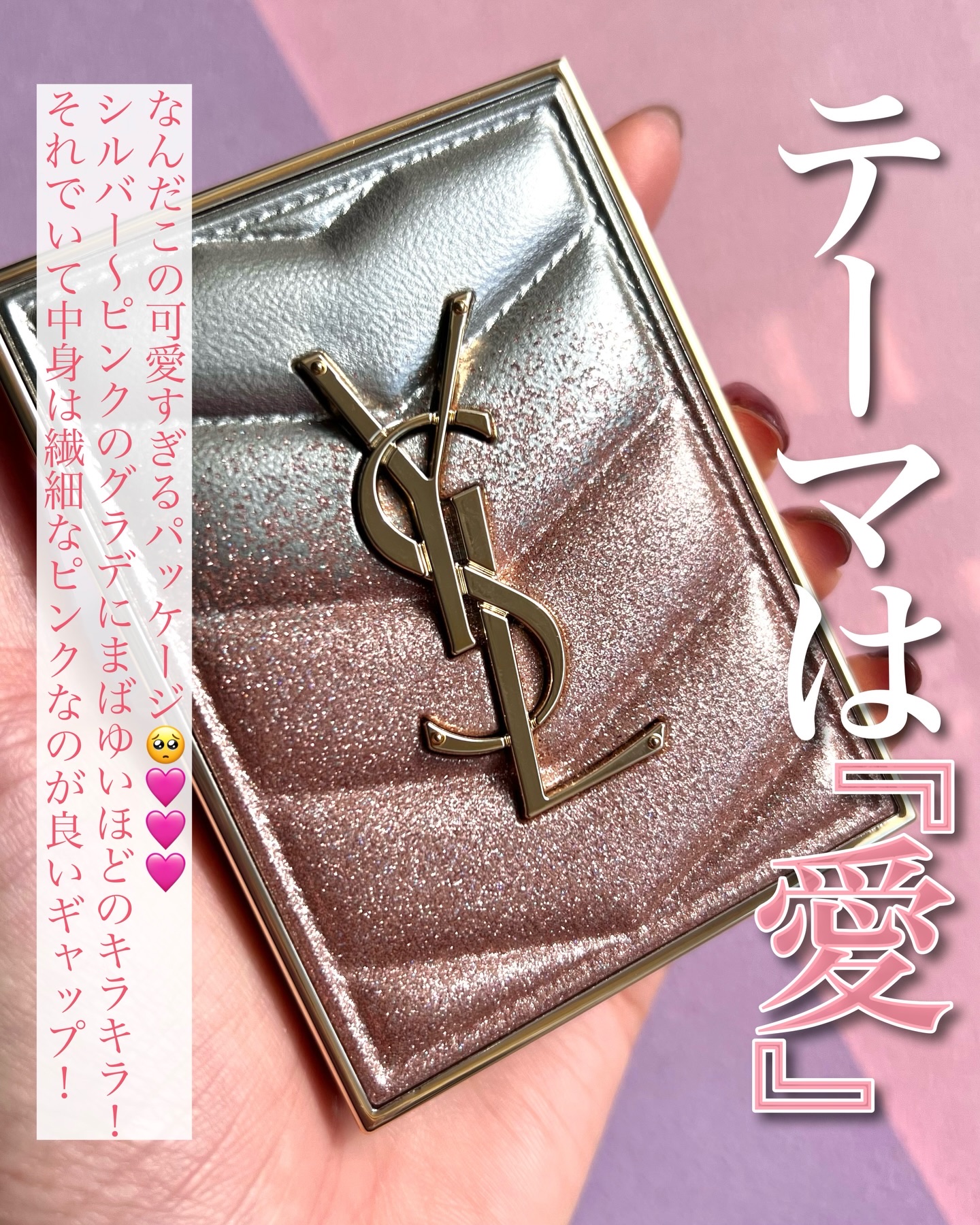 ブルーとピンクのグラデーションパケが目を引く春コスメ🌸 アイシャドウは愛溢れるピンクシェードのパレット。 何よりパッケージが今までの中でダントツに可愛い!好みすぎるの♡ 22,000円(税込)以上購入でポーチもついてきたんだけど同じカラーリングで可愛すぎたー!