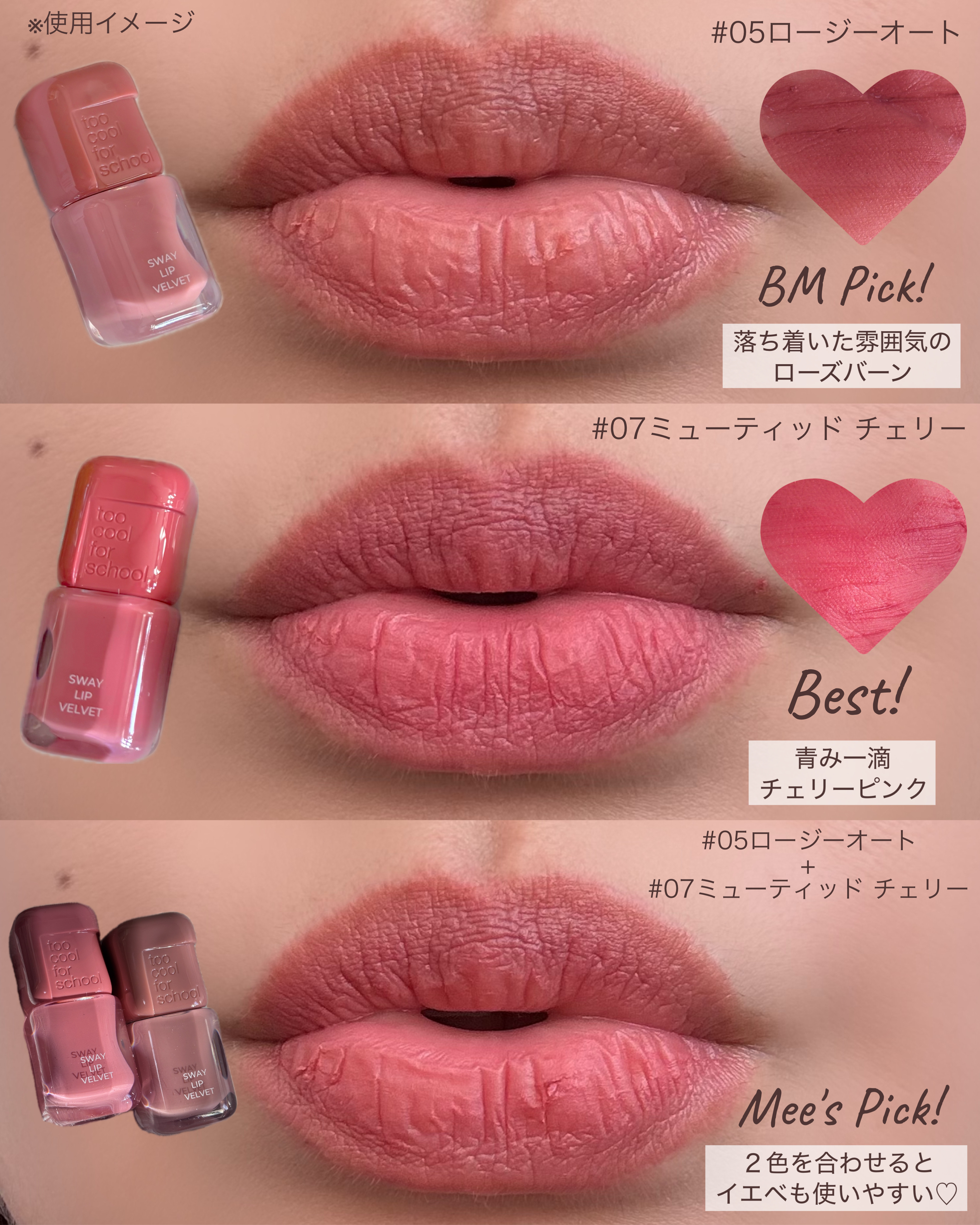 乾燥しないやわらかマットリップTooCoolForSchoolスウェイリップベルベット01ヌードホイップ05ロージーオート各1,740円(税込)乾燥しないやわらかマットリップTooCoolForSchoolスウェイリップベルベットべたつくオイ...