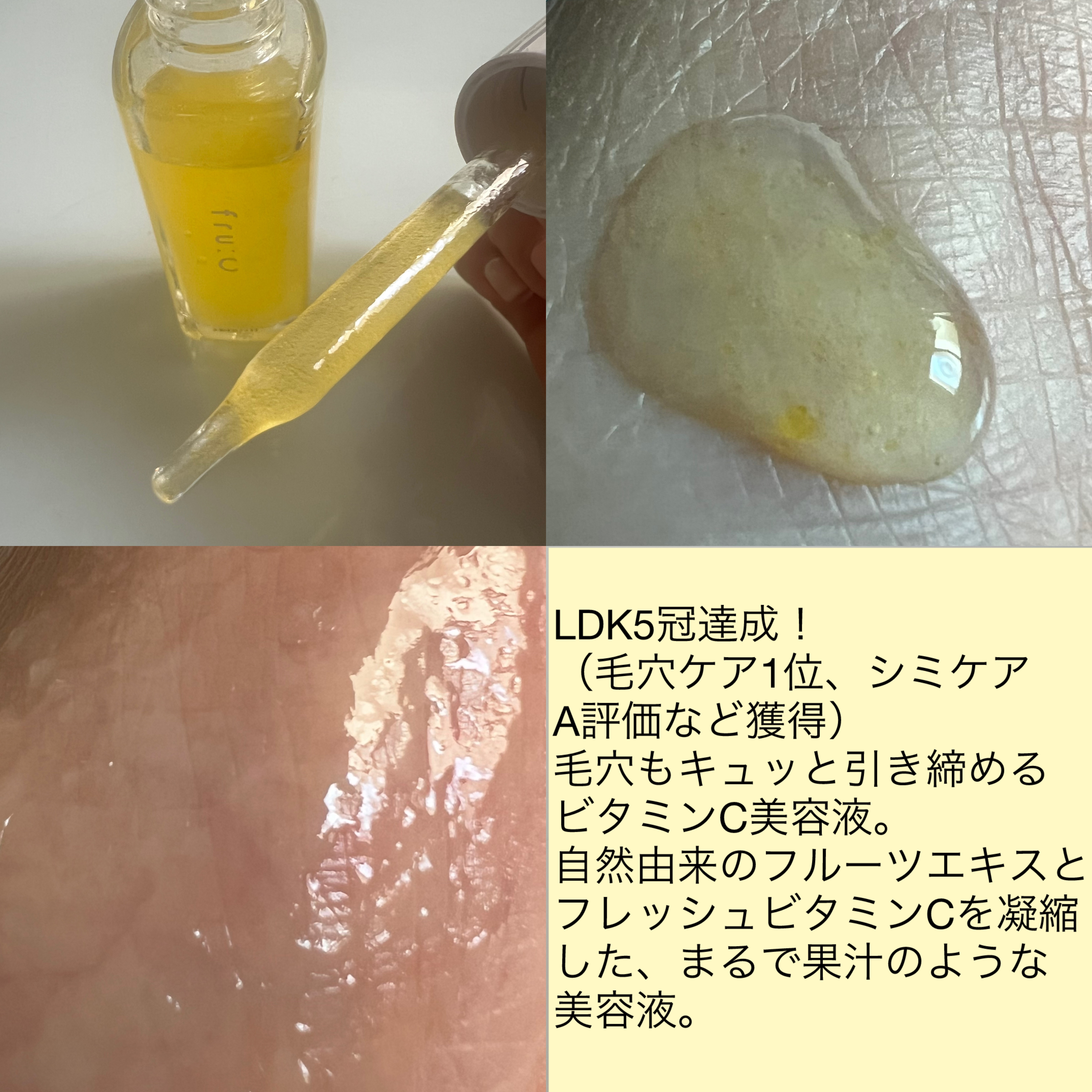 「果汁みたいな一滴で、毛穴つるん。」LDK5冠👑実力派ビタミンC美容液LDKで5冠達成👑毛穴ケア1位も獲得しているFru:C(フルーシー)オールインワンビタミンC美容液🍋厳選された果実のエッセンスとフレッシュなビタミンCを凝縮した、まるで果汁...