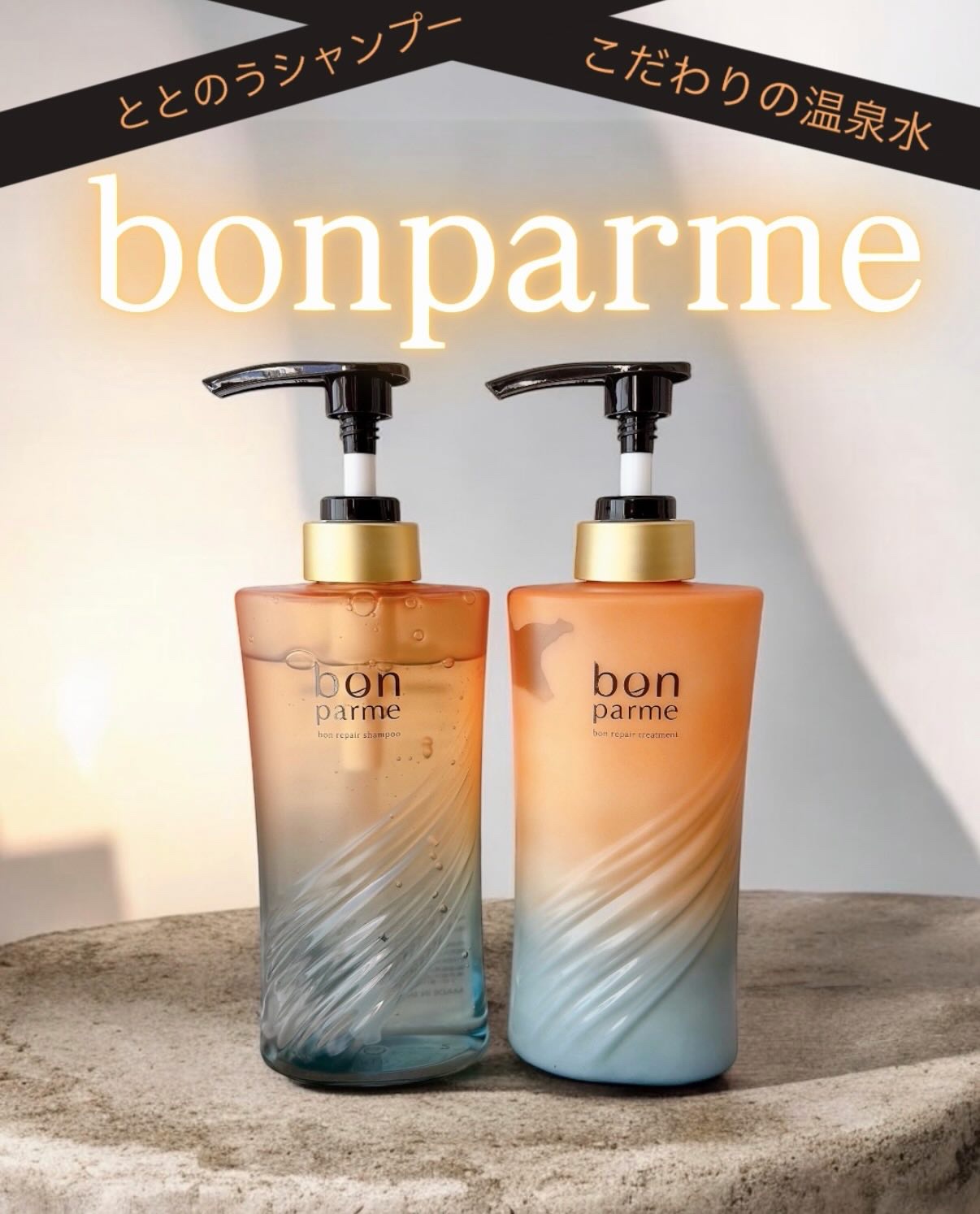 - ダメージも、うねりも、”素直”にするんっ! 毎日のバスタイムで”ととのう”シャンプートリートメント 【アプリコット&ムスクの香り】 ”ととのう”カギは温泉水とテクノロジー するんと指通りが良く、まとまりのある髪でいるためには、キューティクルのケアが必要不可欠。 キューティクルが開いた状態ではせっかくうるおいを与えても逃げてしまい、ダメージは改善しないまま。 ボンパルムではベースの水からパワーを持たせワンランク上のヘアケアを行うために、温泉水に着目しました。 ボンパルム専用の温泉水に美容テクノロジーをかけ合わせ、キューティクルを引き締め、髪の中でうるおいが育まれる環境を作り出します。 ◆セレクト温泉水『シリカ酸性泉』 髪の主成分「ケラチン」の生成を助けるミネラル『シリカ』に、 キューティクルを引き締めてうるおいの流出を防ぐ「酸性泉」を合わせたセレクト温泉水です。 頭皮や髪の傷み、血流不足による抜け毛や白髪などを幅広くケアします。 ◆洗浄と髪の修復にはたらく『美容テクノロジー』 「レチノール」や「アゼライン酸」、「ナイアシンアミド」など 美容クリニックでも使用されるエイジングケア*成分を配合することで頭皮環境をととのえ、 「PPT」や「ヘマチン」など髪のうねりを補正する成分も多数配合しました。 *年齢に応じたケア