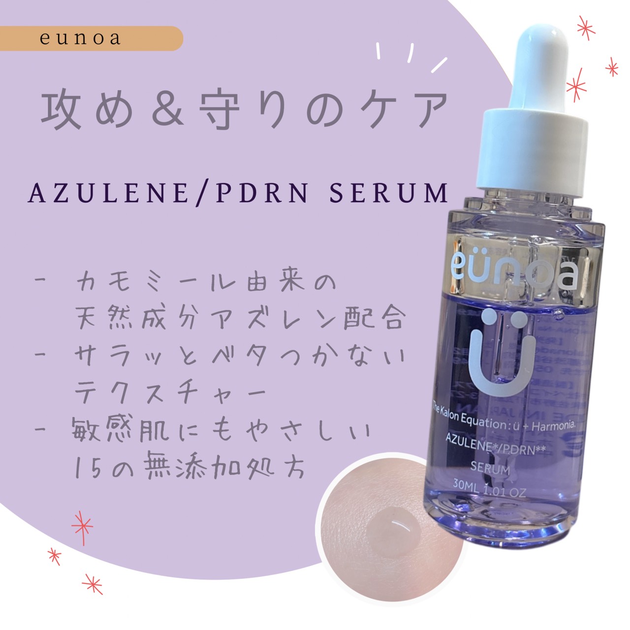 🌹୨୧+°eunoaユノアアズレンPDRNセラム🍓💕目を引くにこにこの可愛いマークと、パープルのパッケージで可愛いです❣️サイズ感も小さめで可愛く、洗面所に置いておくだけでも癒されます♪香りはお花のような良い匂いがして、リラックス効果も。敏感...