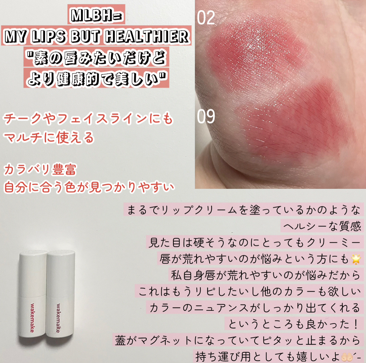 - 塗るたびに、ときめきが走り出す。メイクの楽しさを加速する「#止まらぬリップ」。 肌なじみのいい発色と自然なツヤで今っぽい唇に仕上がる、10色展開。 うるおいをチャージして、ほんのり血色感*¹をじゅわりと与えます。 どんな時でも使いやすい軽やかな塗り心地で、なりたい私を叶える仕上がりに! 【POINT】 ■ヘルシーに魅せる#MLBHリップ 「MLBH =MY LIPS BUT HEALTHIER」。自然なツヤとカラーで、いつもの唇がもっと健康的な印象に見える仕上がりに! ■〝今っぽさ〞を叶える自然なツヤめき ツヤと血色感*¹がほどよく両立。ラズベリーシードオイル*²配合で、うるおいを守りながらツヤめく唇に。 ■軽く均一にフィット。チークにも◎ ひと塗りでムラを防いでフィットし、自然な血色感*¹をプラス。チークにも使えます。 *1 メイクアップ効果による *2 (ラズベリー種子油/コハク酸トコフェロール)アミノプロパンジオールエステルズ(整肌成分)