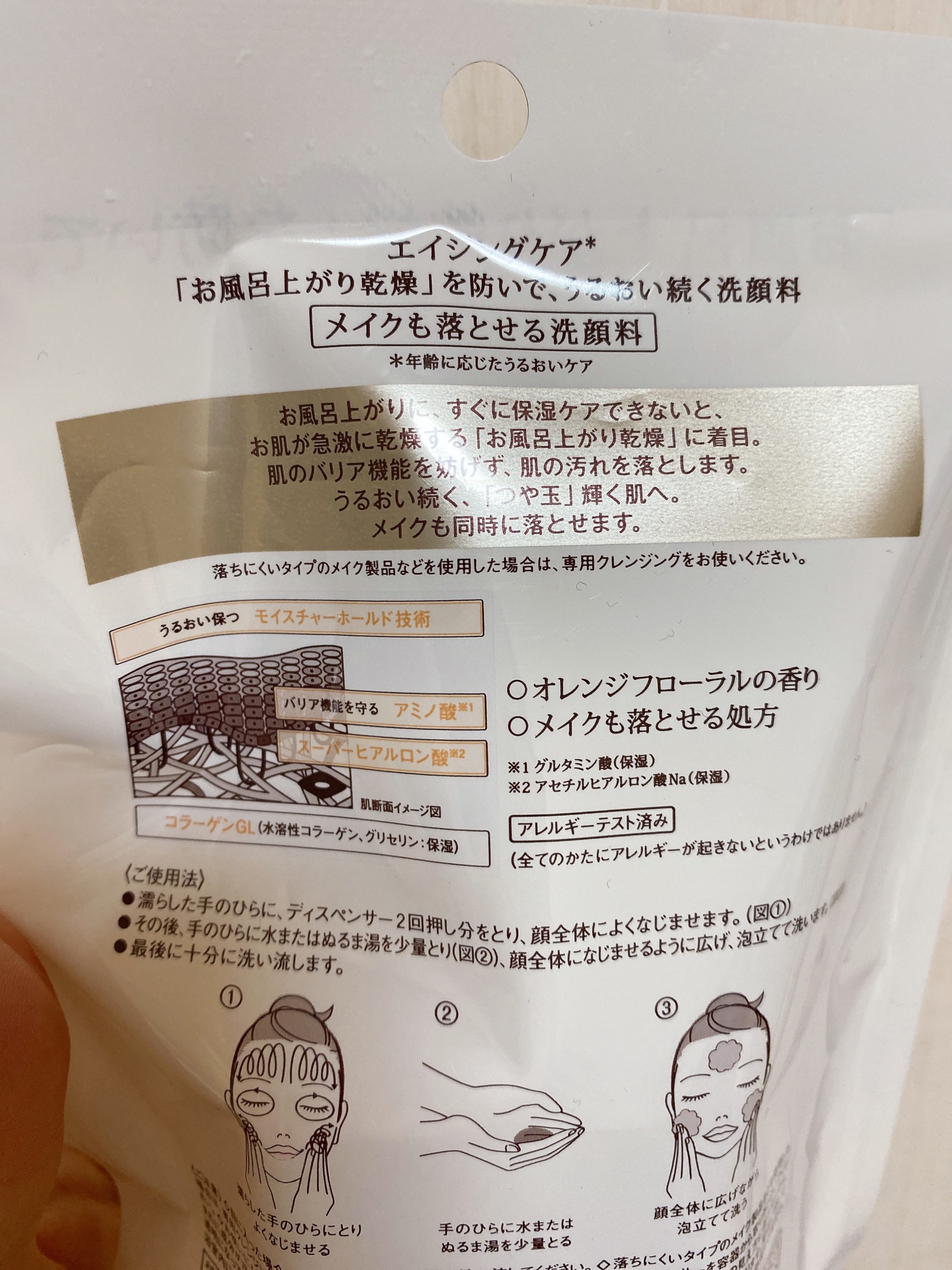 - お風呂上がりの乾燥を実感しながらも、すぐに保湿ケアできないという悩みに着目し、お風呂上がり乾燥を防いでうるおい続く洗顔料です。 ◆ジェルから泡へ変化し肌のバリア機能を妨げないよう、肌の汚れを落とします。うるおい続く、「つや玉」輝く肌へ導きます。 ○肌の汚れだけを取り去りながら、肌本来のバリア機能を妨げず、「お風呂上がり乾燥」を防いで、うるおいを保ちます。 -うるおい続くモイスチャーホールド技術※4 ※4 うるおいを逃がさずホールドする技術のこと -アミノ酸 グルタミン酸(保湿) -スーパーヒアルロン酸 アセチル化ヒアルロン酸Na(保湿) -コラーゲンGL 水溶性コラーゲン、グリセリン(保湿) -選択的洗浄成分 ○メイクも落とせます -メイクとも素早くなじみ泡立ってすっきり落とす、メイクも落とせる処方 ○オレンジフローラルの香り