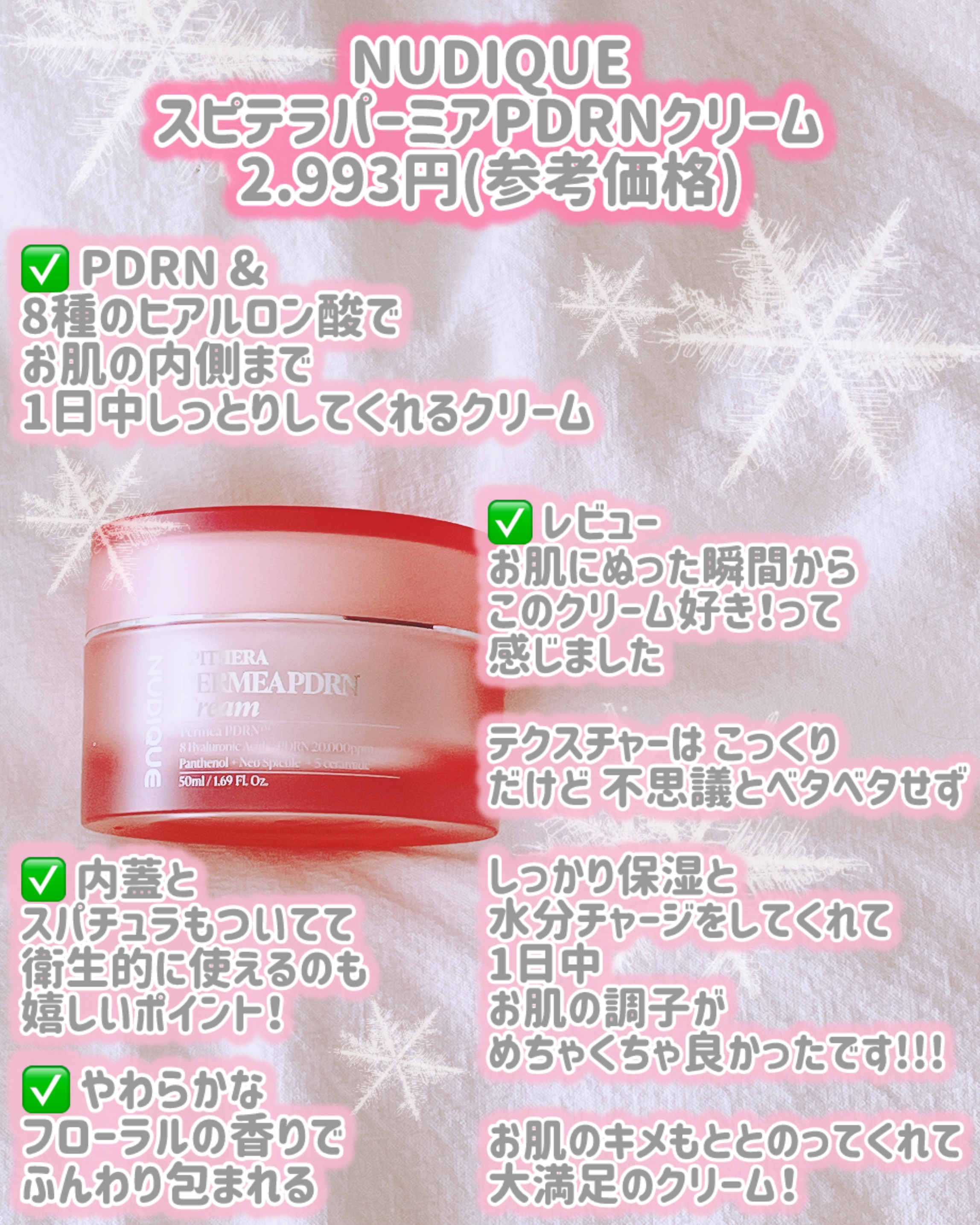 NUDIQUEヌーディークスピテラパーミアPDRNクリーム50mlこっくりしたクリーム!なめらかに伸びてしっとり。お花のようなフローラルな香りでちゃんと香る感じ🌸PDRNと8種のヒアルロン酸配合の肌バリアクリームで第4世代スピキュールがうるお...