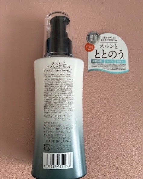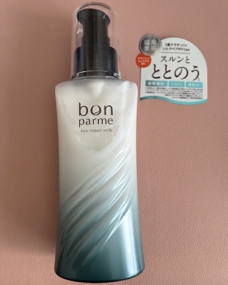 - 髪内部を濃密補修し、水分をぎゅっとチャージ。 ぷるんとうるおい、しなやかに続く“ヘアミルク” 【アプリコット&ムスクの香り】 ボンリペアミルクは、髪内部に「濃密補修」を届け、水分をギュッとチャージする洗い流さないトリートメントミルクです。 うるおいを内に秘めたしなやかな質感が続き、自然でまとまりのある“素髪感”へ導きます。 3種のペプチドと3重ケラチンによる高浸透補修がダメージホールをピンポイントで補修し、失われた密度感を取り戻して弾力のある髪に。 ヒアルロン酸、ペンタパイティン、温泉水による多層的保湿・保水成分が内部からのうるおいを閉じ込め、ぷるんとなめらかな髪へ導きます。 ◆セレクト温泉水『シリカ酸性泉』 髪の主成分「ケラチン」を支えるミネラル『シリカ』と、 キューティクルをきゅっと引き締め水分を閉じ込める「酸性泉」を組み合わせた温泉水。 乾燥や摩擦、紫外線などの外的ダメージから髪を守ります。 ◆髪を満たす『濃密補修&保水成分』 3重ケラチン・3種ペプチド・加水分解コラーゲンに加え、 ヒアルロン酸やペンタバイティンを配合。 髪内部にうるおいをたっぷりチャージし、毛先までしなやかで弾むような質感へ。 ◆スキンケア発想の『美容成分』 「ナイアシンアミド」「CICA」「ビタミンC誘導体」など、 美容分野でも注目される成分を配合。 髪と頭皮を健やかに整え、ハリ・コシを与えながら、 日中のダメージから髪を守ります。 *年齢に応じたケア