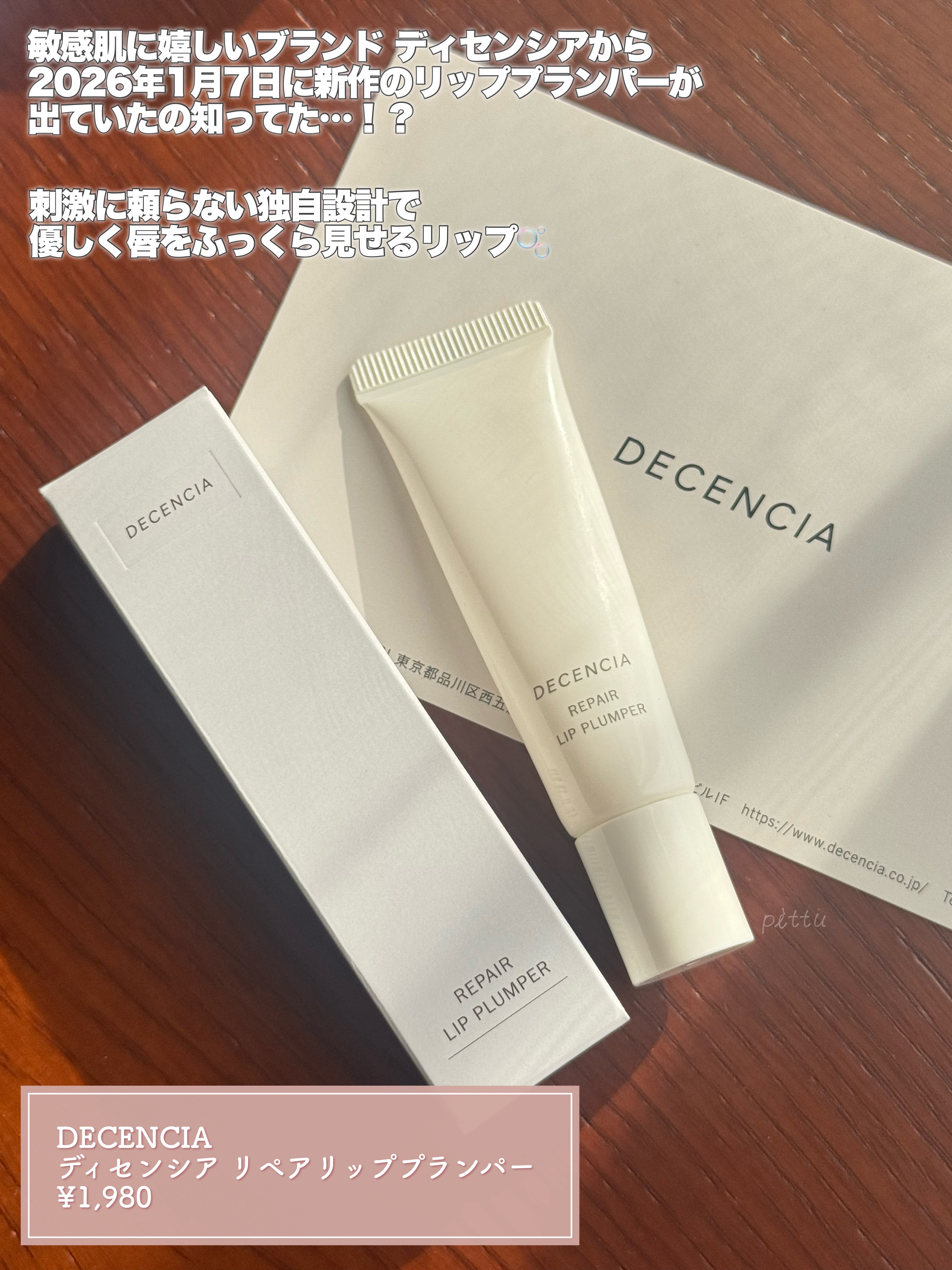 1月7日発売🎊ポーラ・オルビスグループの化粧品ブランドDECENCIAから新商品ディセンシアリペアリッププランパー〈敏感肌用リップ美容液〉10g微細化した高密度の固形リップと高粘度の液状リップを合わせた刺激に頼らない特殊な製法でぷっくり、ぷる...