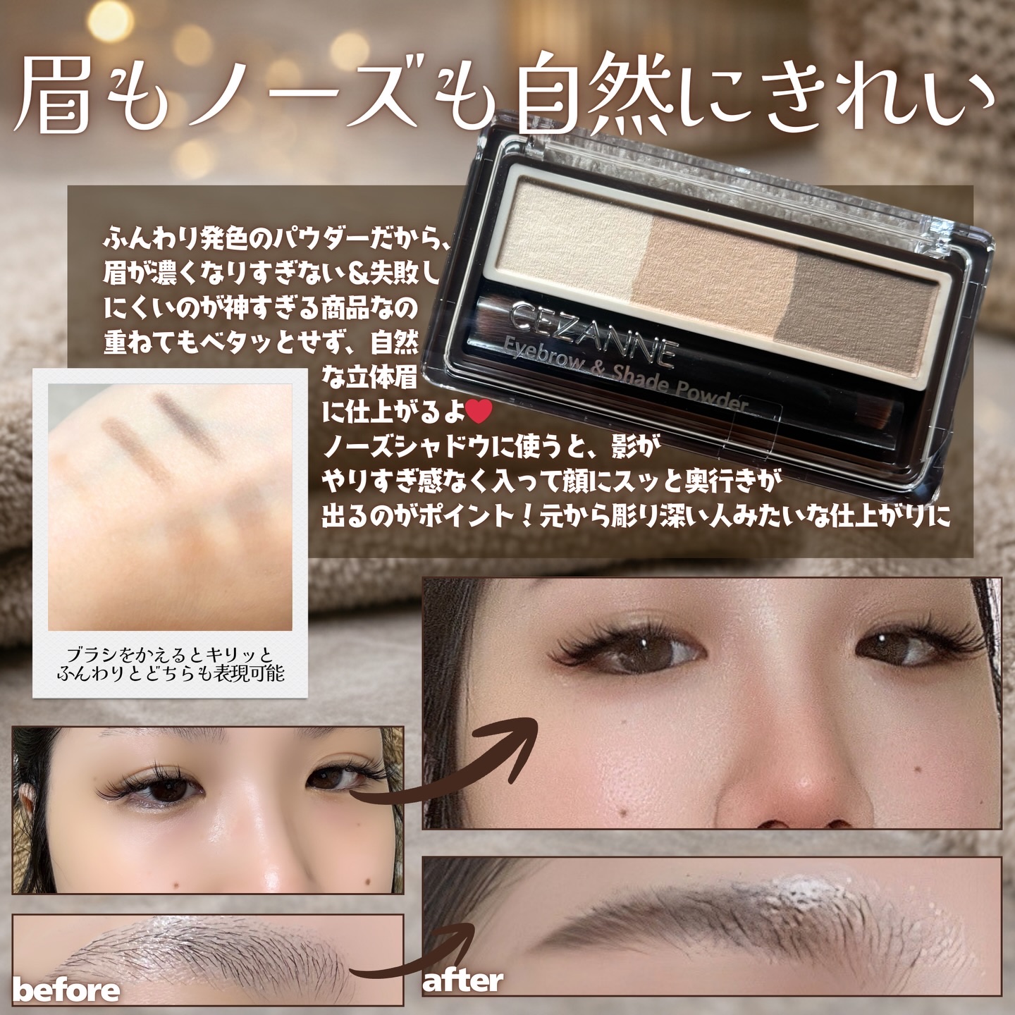 - ノーズシャドウ入り眉パウダー。 彫り深&ふんわり立体眉で目元の印象アップ。 ノーズシャドウにも使える、3色グラデーションのパウダータイプ。 皮脂吸着パウダー配合で、パウダーなのに落ちにくく、ふんわり美眉が長持ち。